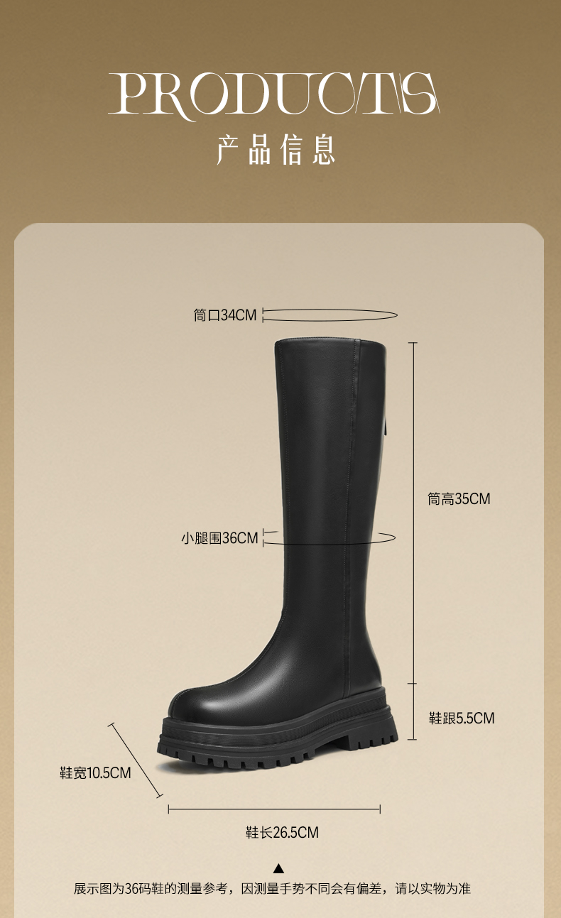 | 靴筒筒面材质:人造革 | 靴筒小腿围:36CM | 里料材质:猪皮革织物面料 | 制鞋工艺:胶贴皮鞋 | 鞋垫材质:猪皮革 |