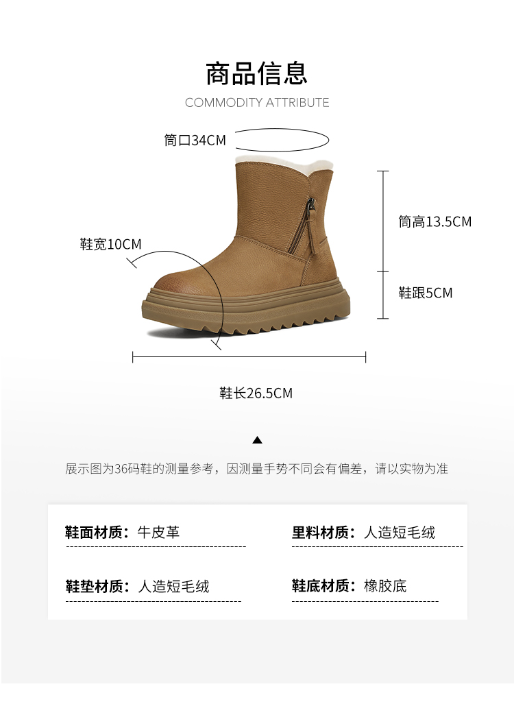 | 帮面材质:牛皮革 | 配跟:无 | 靴筒口围:34CM | 上市时间:2024年冬季 | 鞋类流行款式:雪地靴 |