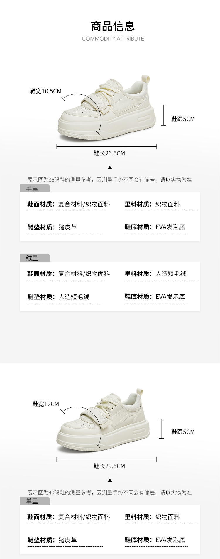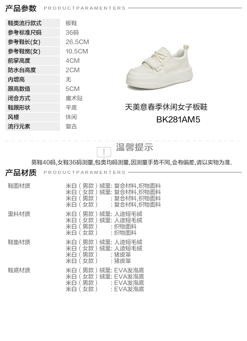 | 参考鞋宽(女):10.5CM | 风格:休闲 | 年份:2024年 | 色系:米色 | 参考标准尺码:36码 |