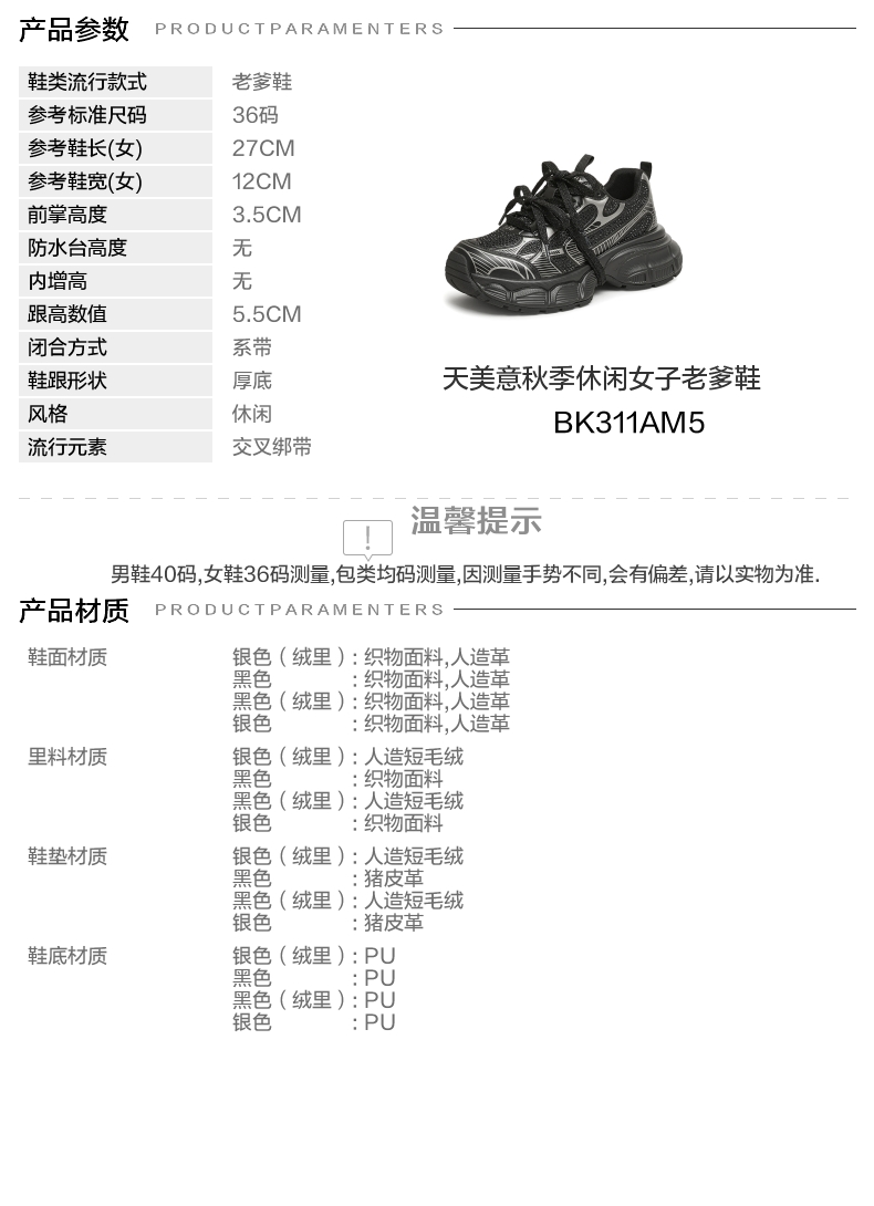 | 参考鞋宽(女):12CM | 风格:休闲 | 年份:2024年 | 色系:黑色 | 参考标准尺码:36码 |