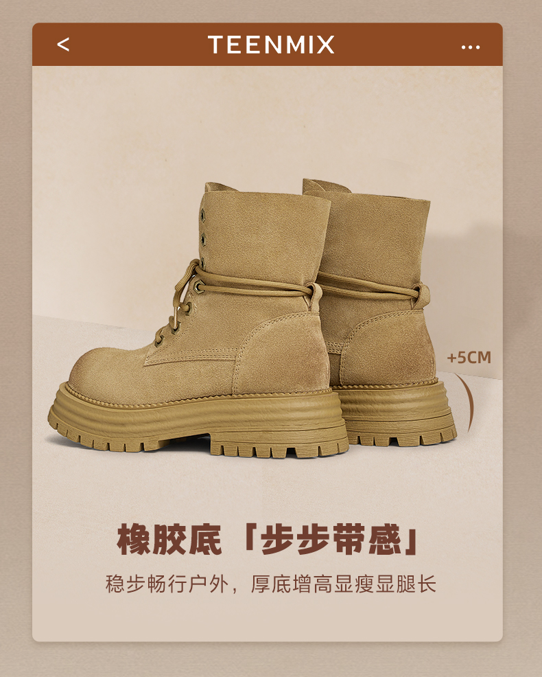 | 鞋底材质:橡胶底 | 靴筒内里材质:猪皮革织物面料 | 内增高:无 | 鞋面材质:牛剖层皮革 | 闭合方式:系带 |
