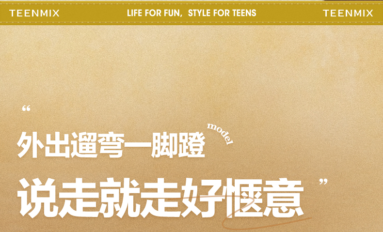 Teenmix(天美意),作为一个都市时尚休闲品牌,倡导“life for fun ,style for teens”即 “人生追求情趣,年轻追求个性”的生活品位,迎合都市年轻人不拘一格,追求mix&match自由组合,创出自我风格的潮流理念。Teenmix向人们展示了流行的转变,强调创意与个性,“teen”代表一群张扬个性、散发活力、追求都市炫彩生活的新新人群;“ mix”即mix&match,代表时尚混搭精神,品牌为年轻人提供恍如贴身订造的时尚潮品,并因应时尚的转变而响应。“随我意,天美意”传达了品牌的主张与个性。