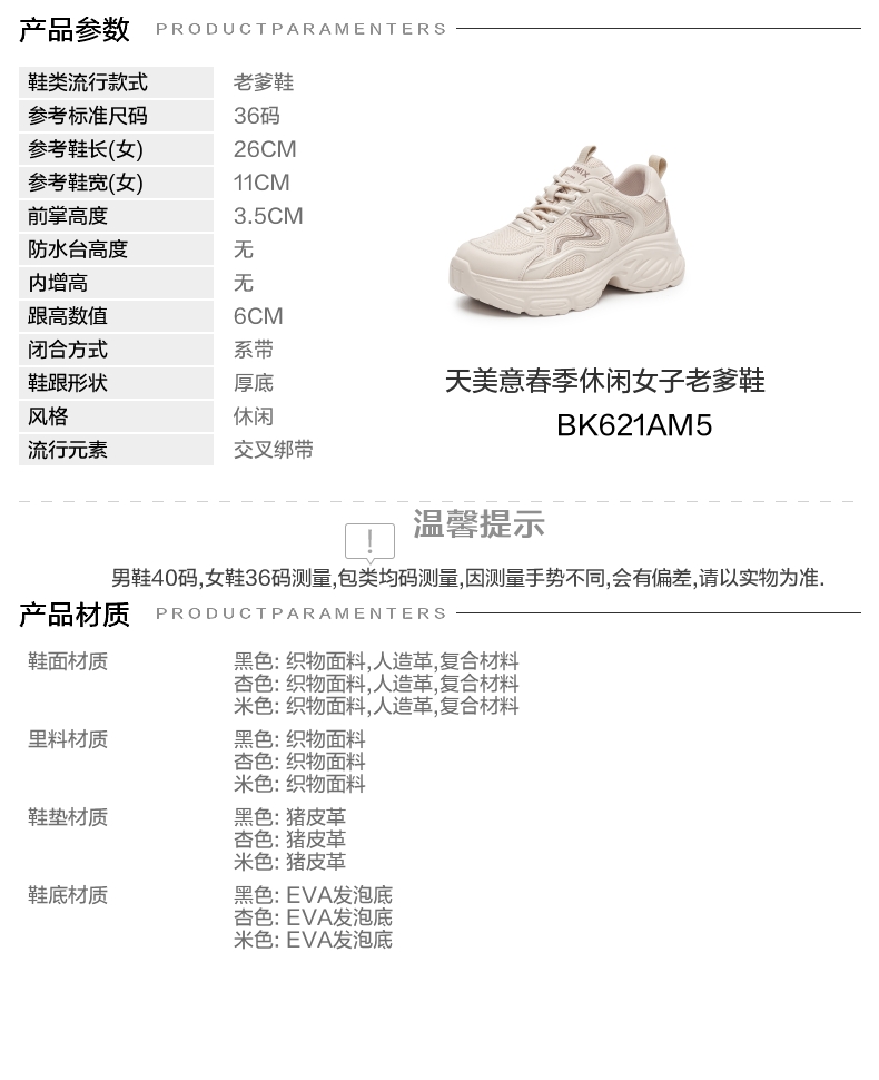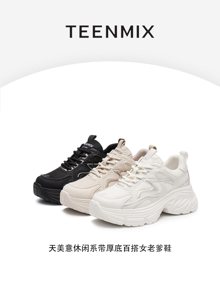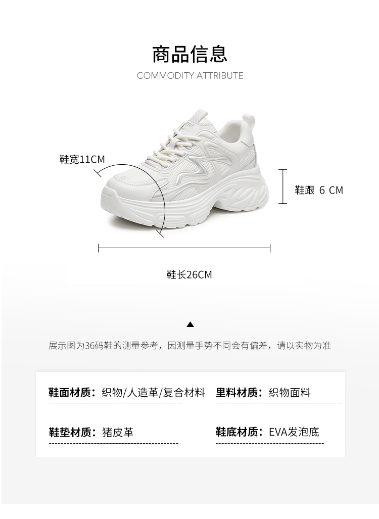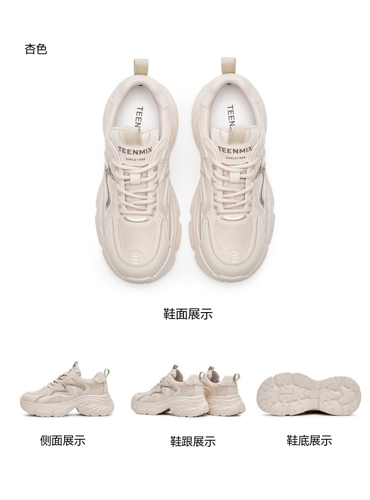 | 风格分类:老爹鞋 | 上市时间:2025年春季 | 鞋类流行款式:老爹鞋 | 鞋头款式:圆头 | 执行标准:旅游鞋GB/T15107-2013 |