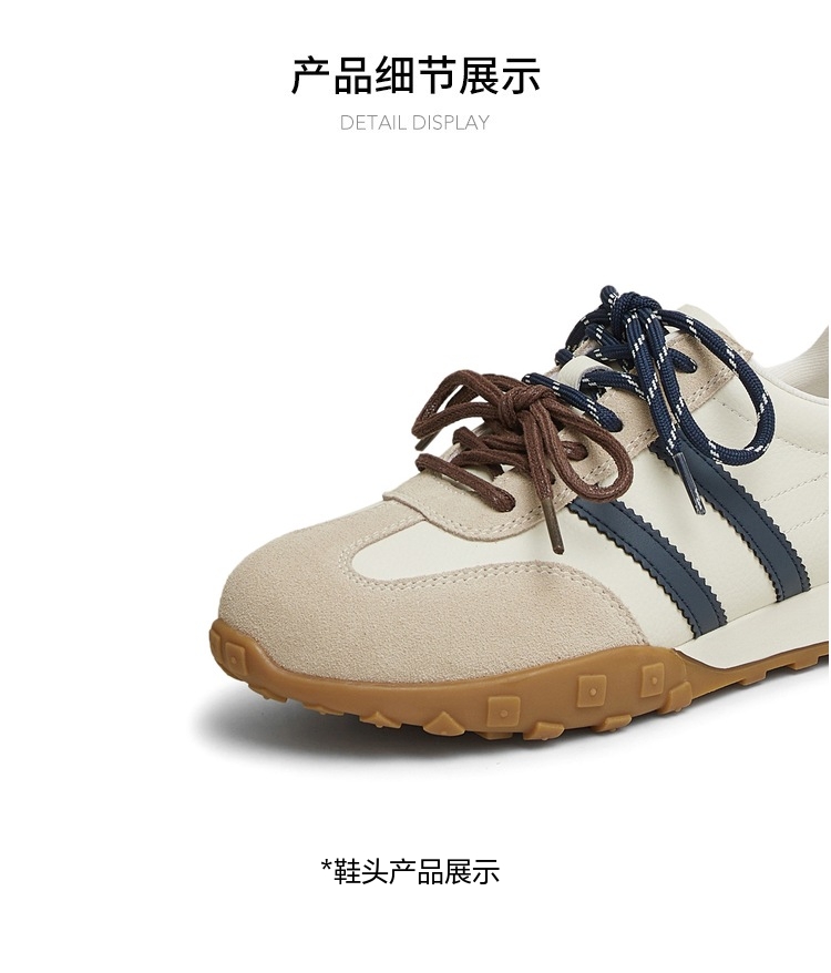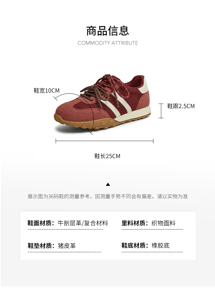 | 风格分类:德训鞋 | 上市时间:2025年春季 | 鞋类流行款式:休闲鞋 | 鞋头款式:圆头 | 执行标准:舒适运动鞋Q/LR002-2023 |