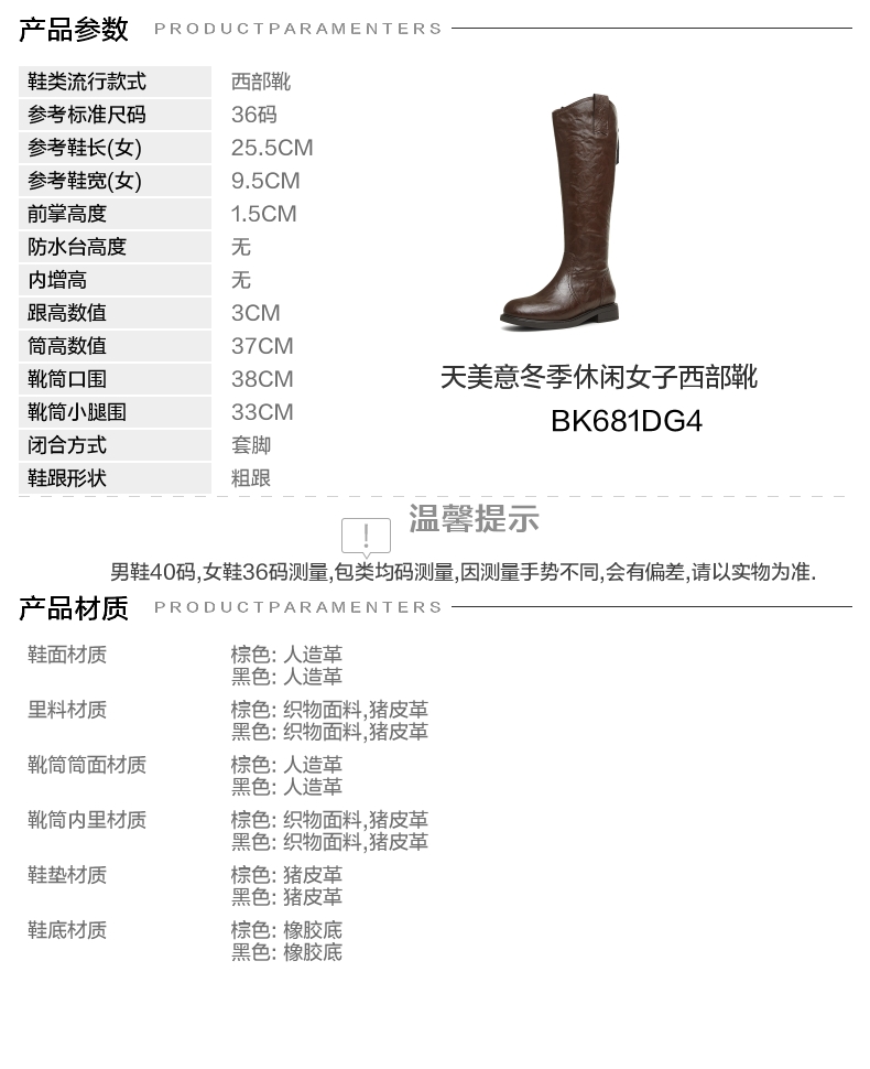 | 风格:休闲 | 色系:棕色 | 跟高数值:3CM | 性别:女子 | 筒高数值:37CM |