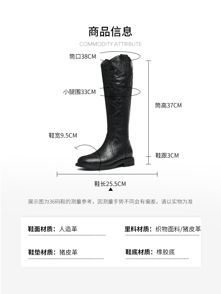 | 靴筒筒面材质:人造革 | 靴筒小腿围:33CM | 里料材质:织物面料猪皮革 | 制鞋工艺:胶贴皮鞋 | 鞋垫材质:猪皮革 |