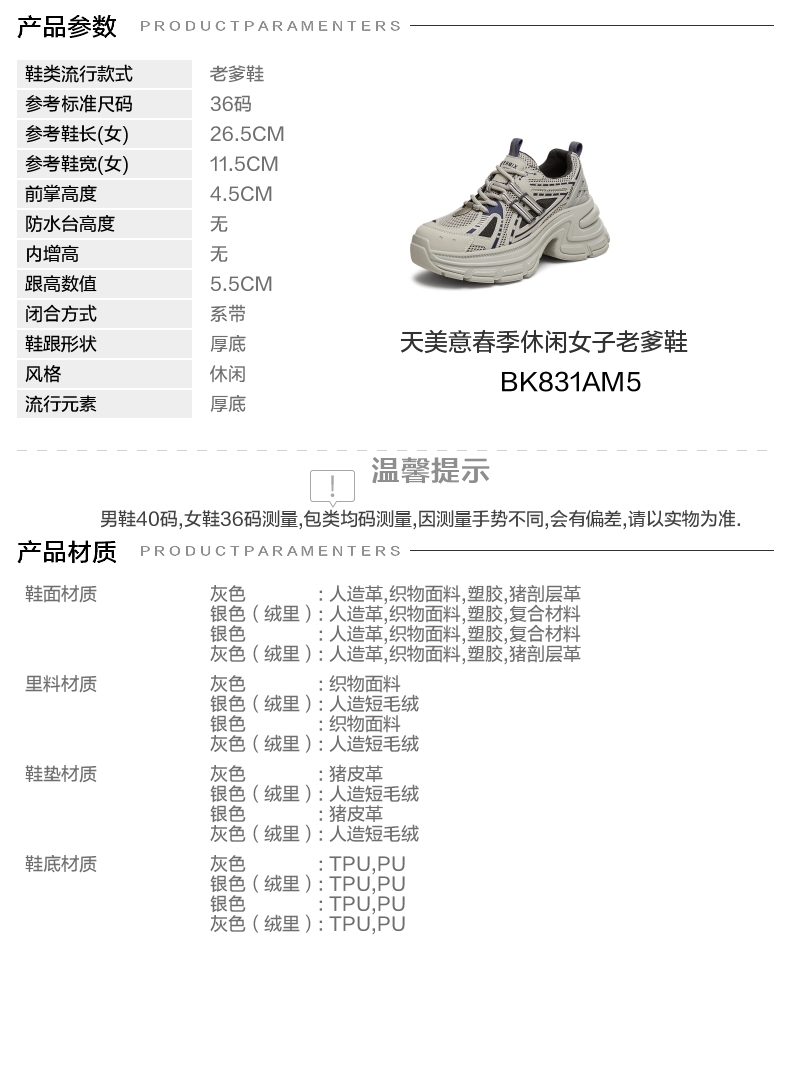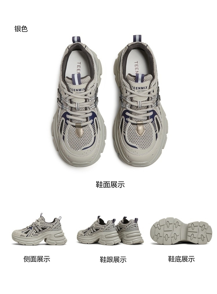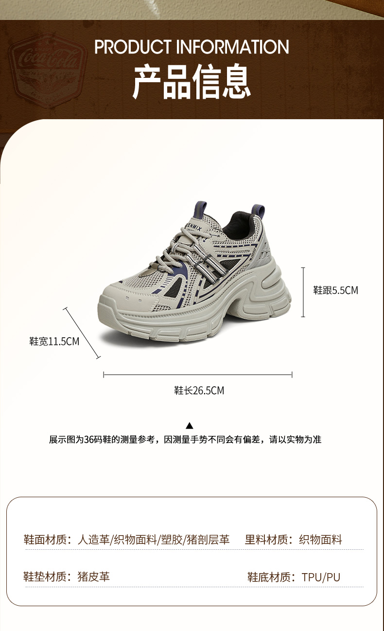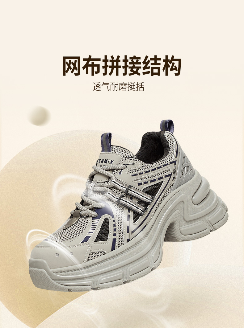 | 上市时间:2025年春季 | 鞋类流行款式:老爹鞋 | 鞋头款式:圆头 | 执行标准:旅游鞋GB/T15107-2013 | 跟高范围:高跟鞋(6-8CM) |