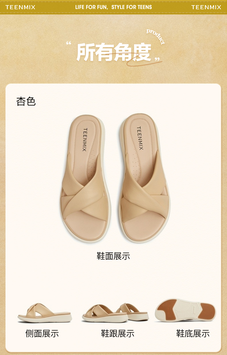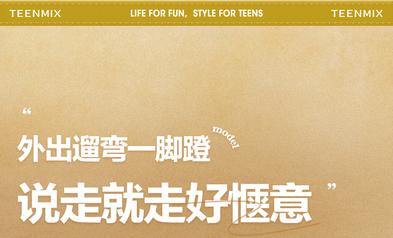 Teenmix(天美意),作为一个都市时尚休闲品牌,倡导“life for fun ,style for teens”即 “人生追求情趣,年轻追求个性”的生活品位,迎合都市年轻人不拘一格,追求mix&match自由组合,创出自我风格的潮流理念。Teenmix向人们展示了流行的转变,强调创意与个性,“teen”代表一群张扬个性、散发活力、追求都市炫彩生活的新新人群;“ mix”即mix&match,代表时尚混搭精神,品牌为年轻人提供恍如贴身订造的时尚潮品,并因应时尚的转变而响应。“随我意,天美意”传达了品牌的主张与个性。