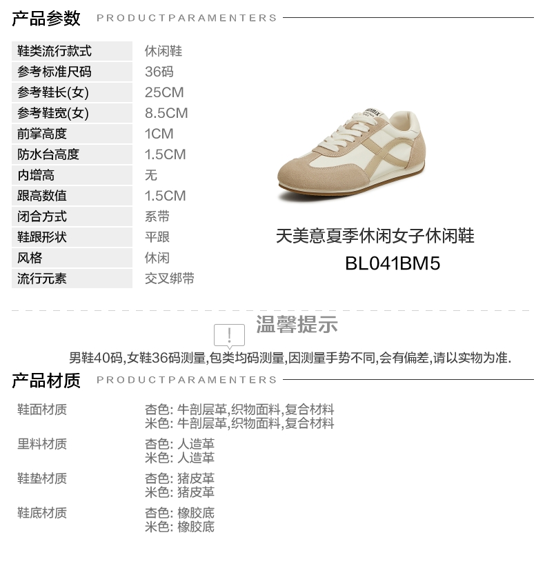 | 参考鞋宽(女):8.5CM | 风格:休闲 | 年份:2025年 | 色系:杏色 | 参考标准尺码:36码 |