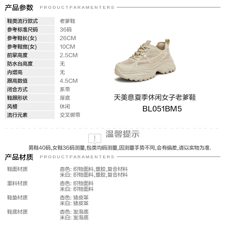 | 参考鞋宽(女):10CM | 风格:休闲 | 年份:2025年 | 色系:杏色 | 参考标准尺码:36码 |