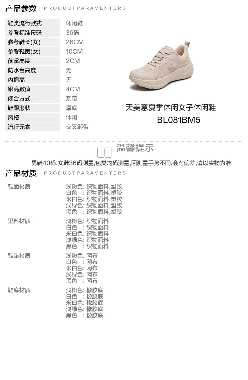 | 闭合方式:系带 | 风格:休闲 | 跟高数值:4CM | 色系:粉色 | 配跟:无 |