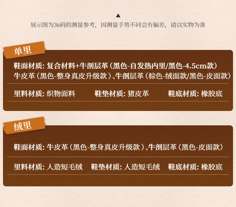 | 款式季节:冬季 | 前掌高度:无 | 皮质特征:人造革 | 防水台高度:无 |