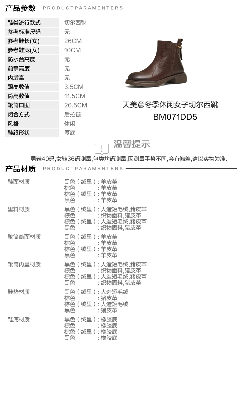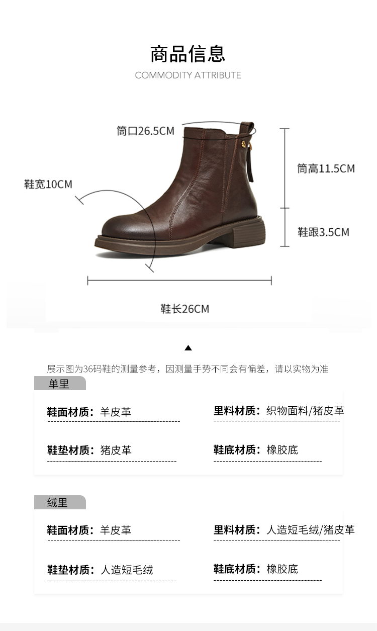 | 筒高数值:11.5CM | 靴筒筒面材质:羊皮革 | 里料材质:猪皮革织物面料 | 制鞋工艺:胶贴皮鞋 | 鞋垫材质:猪皮革 |