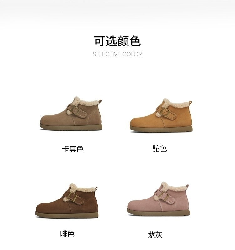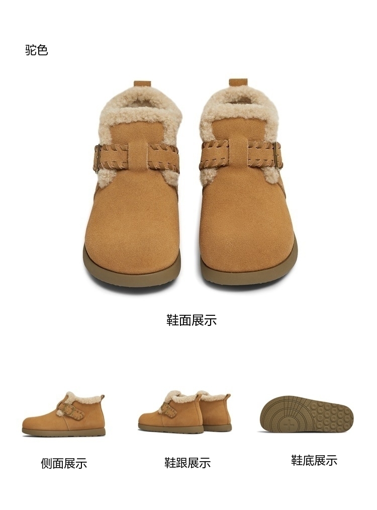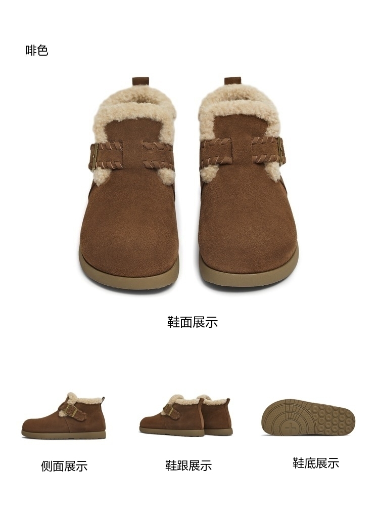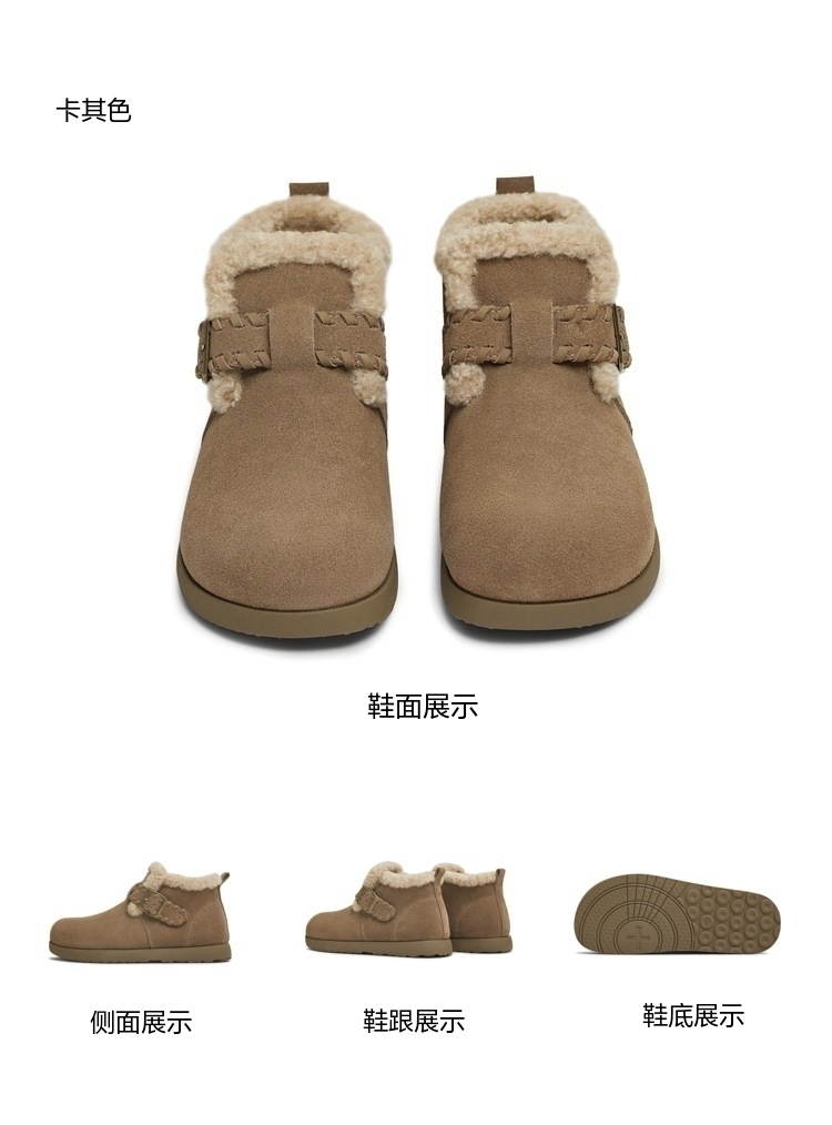 | 鞋底材质:橡胶底 | 靴筒内里材质:人造毛 | 内增高:无 | 鞋面材质:牛剖层革 | 闭合方式:一字式扣带 |