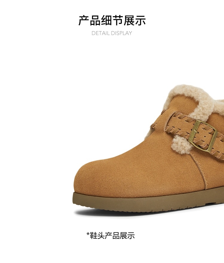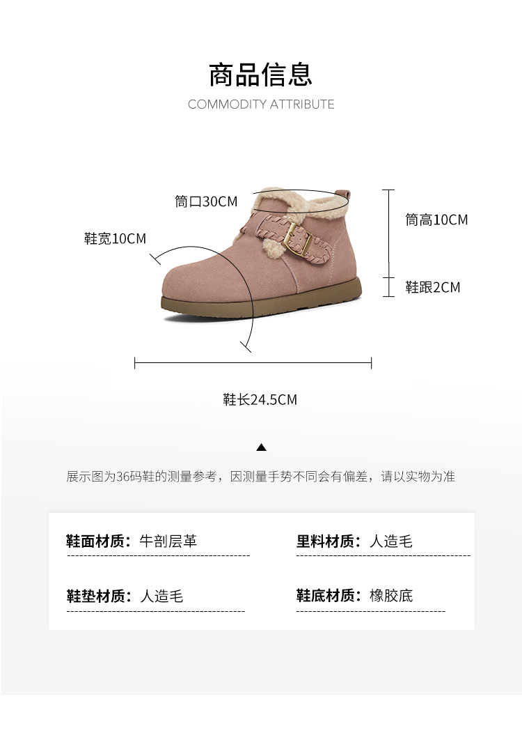 | 帮面材质:牛剖层革 | 配跟:无 | 靴筒口围:30CM | 上市时间:2025年冬季 | 鞋类流行款式:雪地靴 |