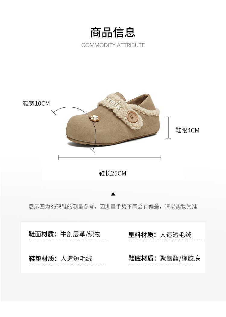 | 鞋面内里材质:人造短毛绒 | 色系:卡其 | 跟高数值:4CM | 性别:女子 | 里料材质:人造短毛绒 |