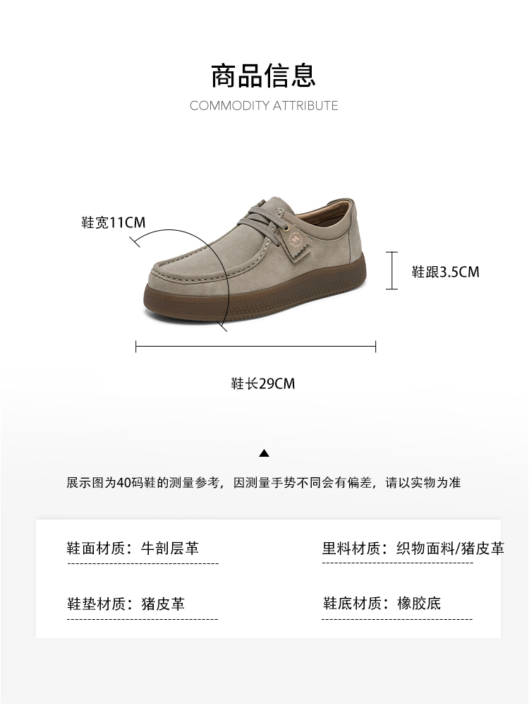 | 鞋面材质:牛剖层革 | 适用场合:日常休闲 | 闭合方式:系带 | 所在区域:电子商务 | 40码鞋宽参考(男):11CM |