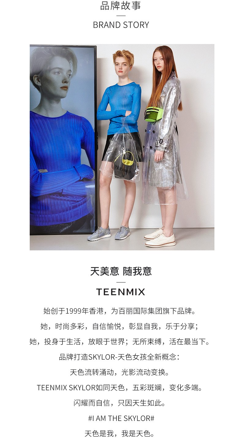 Teenmix(天美意),作为一个都市时尚休闲品牌,倡导“life for fun ,style for teens”即 “人生追求情趣,年轻追求个性”的生活品位,迎合都市年轻人不拘一格,追求mix&match自由组合,创出自我风格的潮流理念。Teenmix向人们展示了流行的转变,强调创意与个性,“teen”代表一群张扬个性、散发活力、追求都市炫彩生活的新新人群;“ mix”即mix&match,代表时尚混搭精神,品牌为年轻人提供恍如贴身订造的时尚潮品,并因应时尚的转变而响应。“随我意,天美意”传达了品牌的主张与个性。