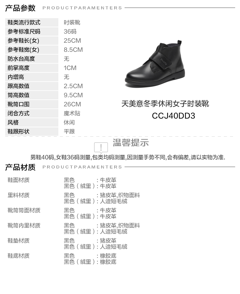 | 参考鞋宽(女):9CM8.5CM | 风格:休闲 | 色系:黑色 | 跟高数值:2.5CM | 筒高数值:9.5CM |