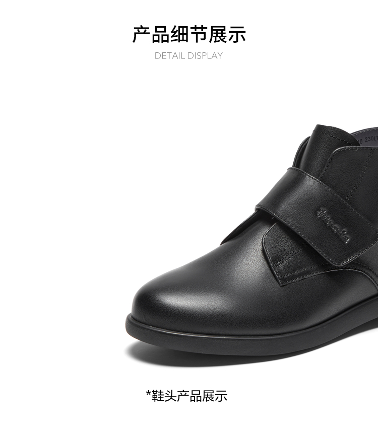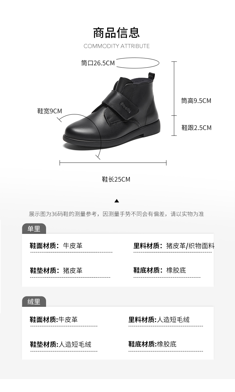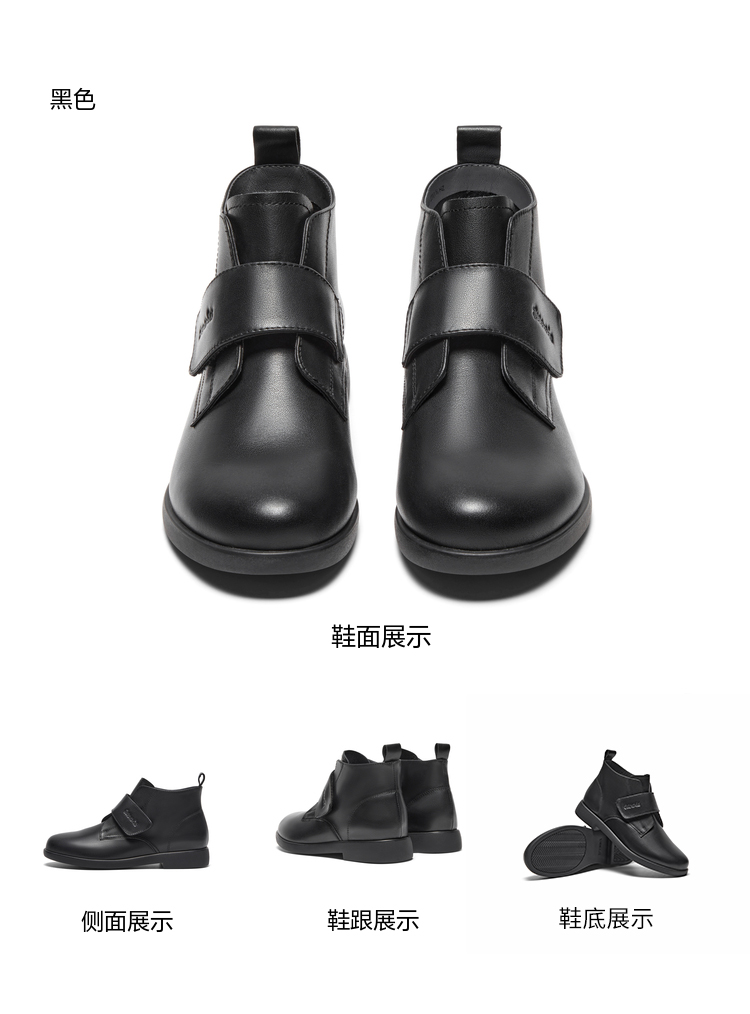 | 鞋底材质:橡胶底 | 靴筒内里材质:织物面料猪皮革 | 内增高:无 | 鞋面材质:牛皮革 | 闭合方式:魔术贴 |
