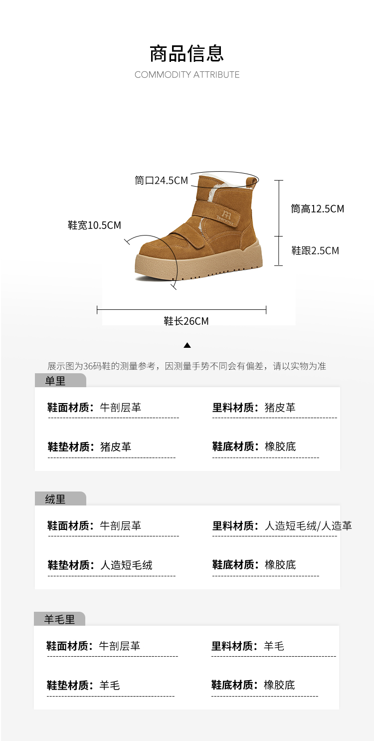| 帮面材质:牛剖层革 | 配跟:无 | 靴筒口围:24.5CM | 上市时间:2025年冬季 | 鞋类流行款式:雪地靴 |