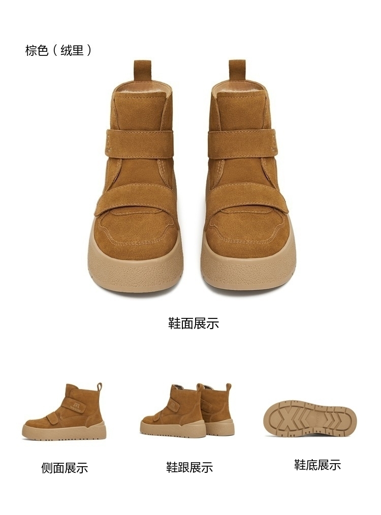 | 鞋底材质:橡胶底 | 靴筒内里材质:人造革人造短毛绒 | 内增高:无 | 鞋面材质:牛剖层革 | 闭合方式:魔术贴 |