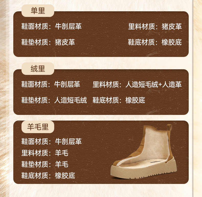 | 帮面材质:牛剖层革 | 配跟:无 | 靴筒口围:24.5CM | 上市时间:2025年冬季 | 鞋类流行款式:雪地靴 |