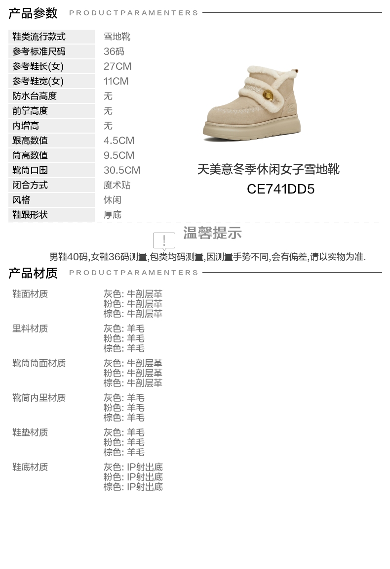 | 款式季节:冬季 | 前掌高度:无 | 皮质特征:二层皮 |