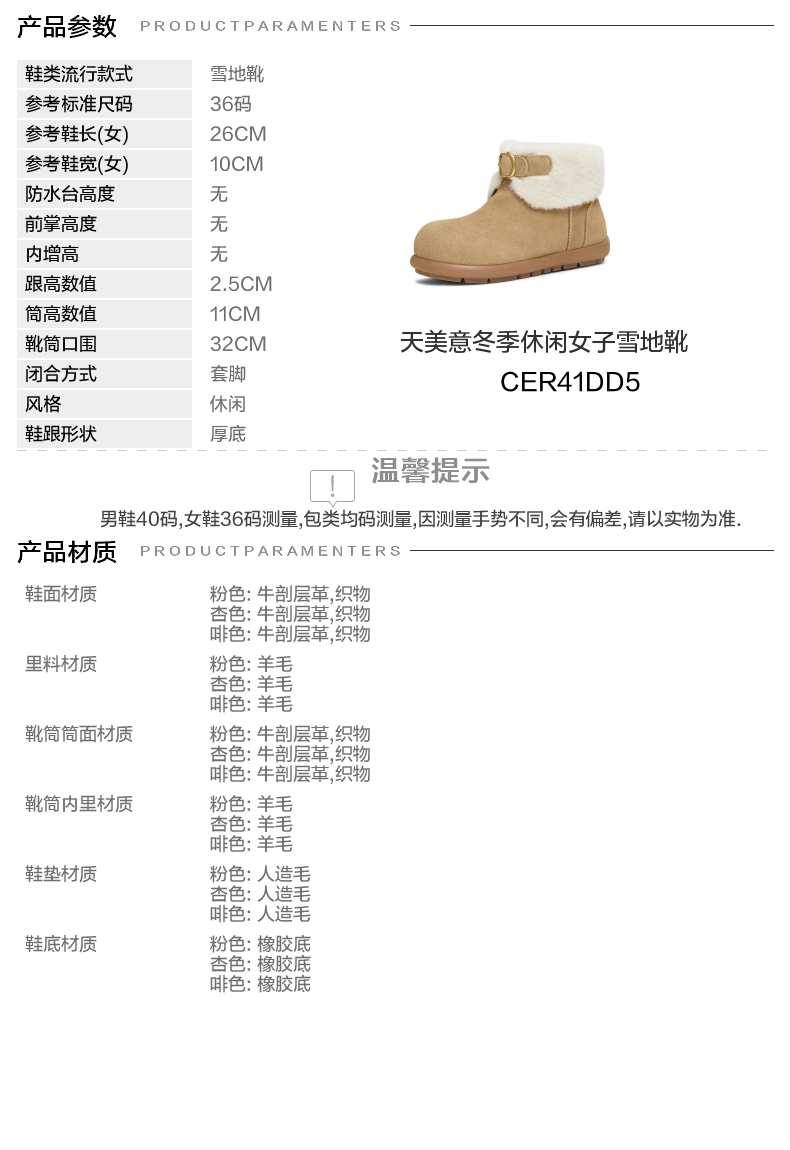 | 参考鞋宽(女):10CM | 风格:休闲 | 鞋面内里材质:羊毛 | 色系:杏色 | 跟高数值:2.5CM |