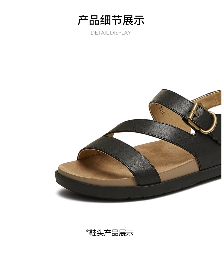 | 鞋头款式:露趾 | 鞋底材质:橡胶底 | 鞋面图案:纯色 | 鞋跟形状:平底 | 鞋面材质:牛皮革 |