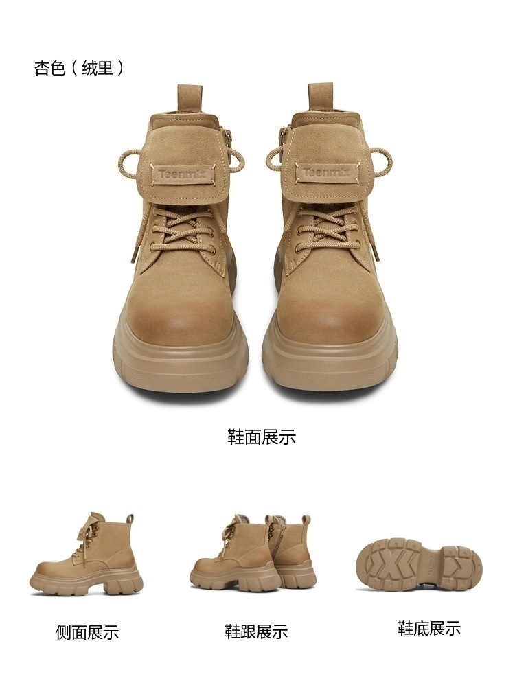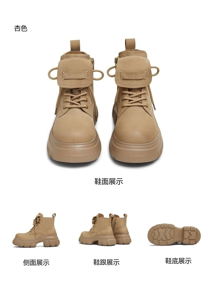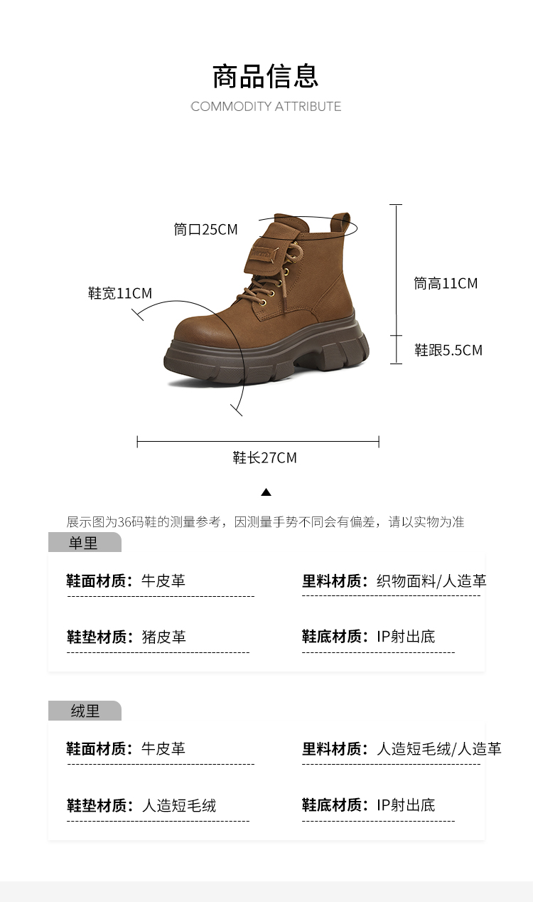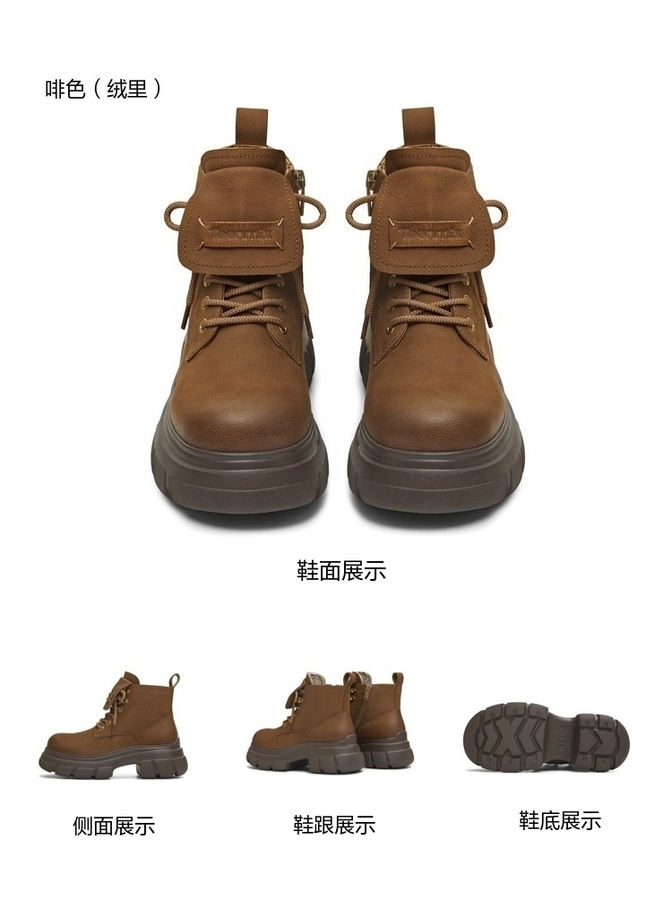 | 鞋底材质:IP射出底 | 靴筒内里材质:人造革人造短毛绒 | 内增高:无 | 鞋面材质:牛皮革 | 闭合方式:系带 |