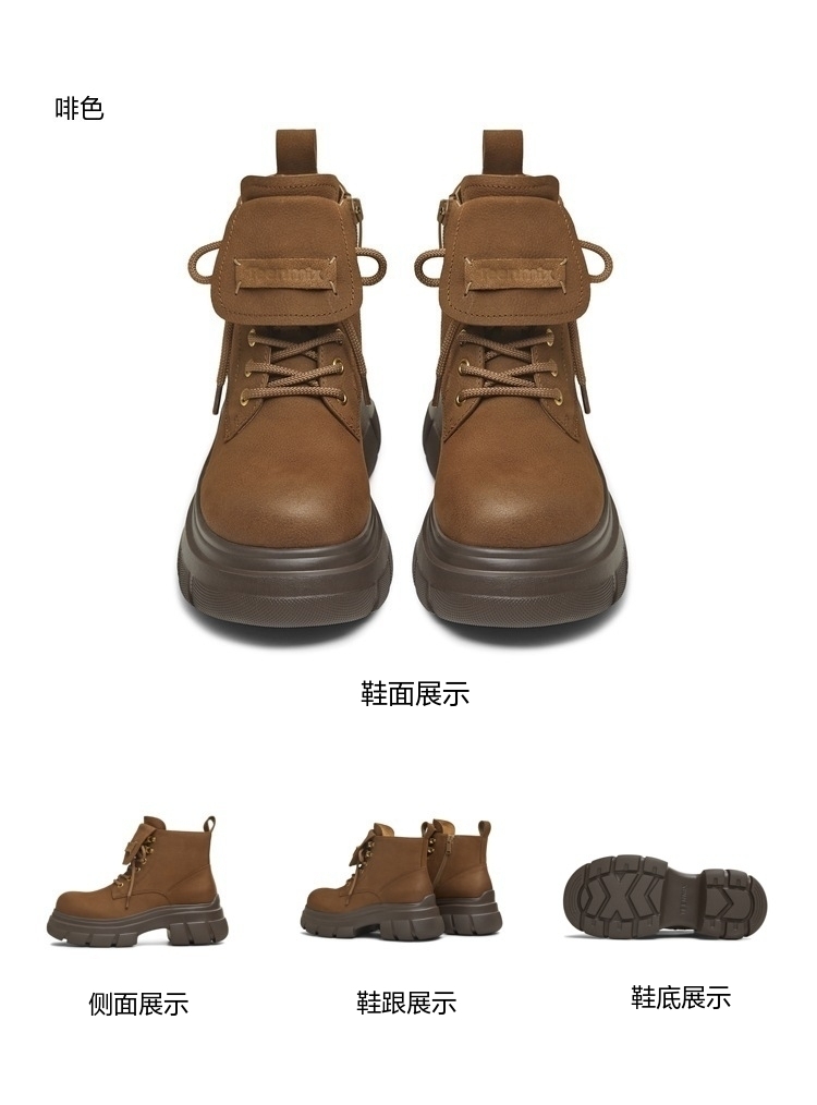 | 鞋底材质:IP射出底 | 靴筒内里材质:人造革人造短毛绒 | 内增高:无 | 鞋面材质:牛皮革 | 闭合方式:系带 |