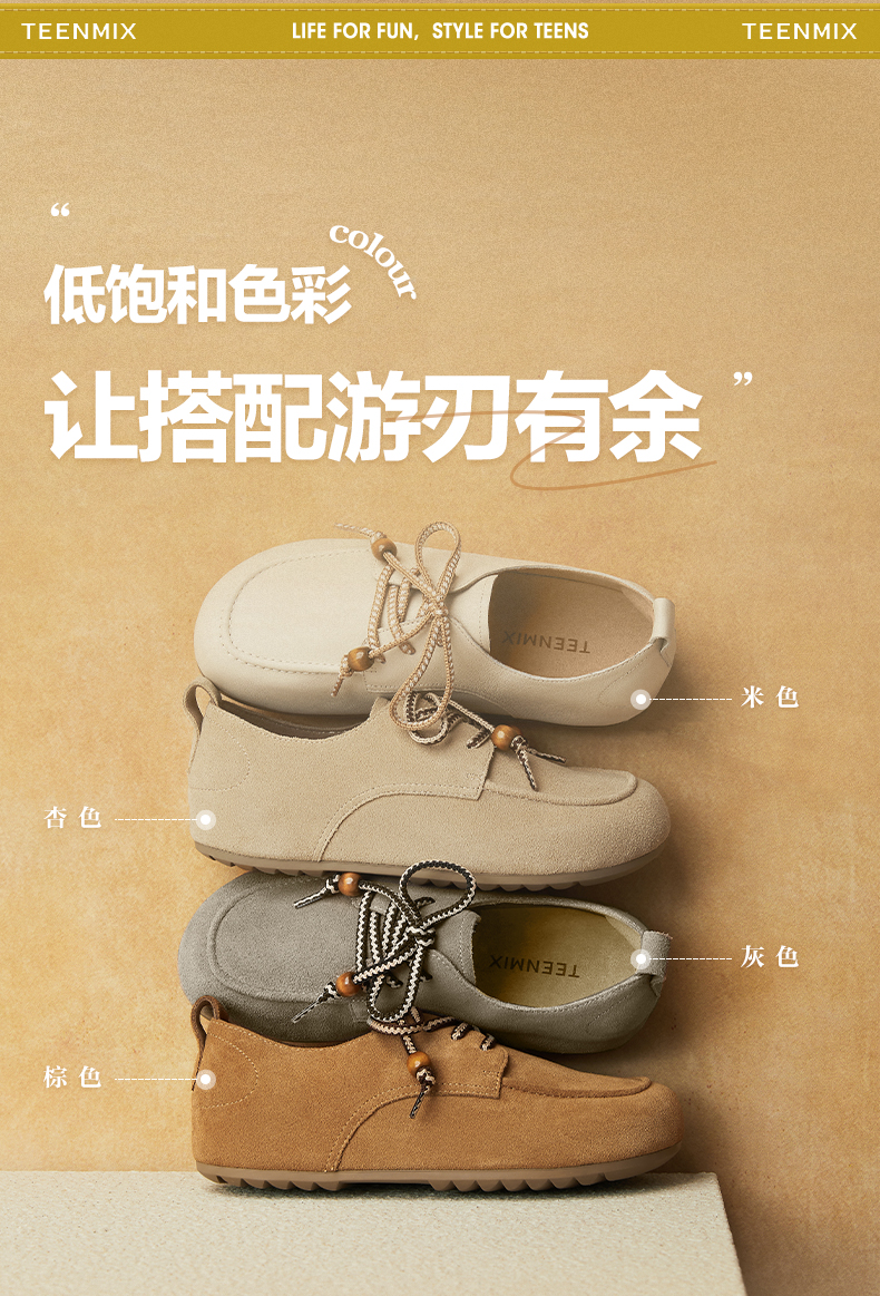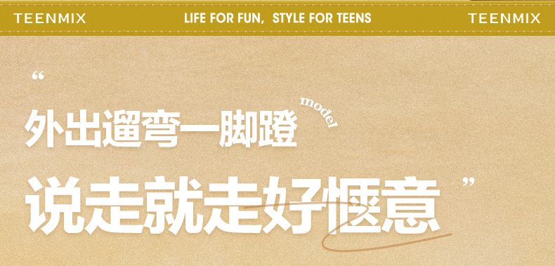 Teenmix(天美意),作为一个都市时尚休闲品牌,倡导“life for fun ,style for teens”即 “人生追求情趣,年轻追求个性”的生活品位,迎合都市年轻人不拘一格,追求mix&match自由组合,创出自我风格的潮流理念。Teenmix向人们展示了流行的转变,强调创意与个性,“teen”代表一群张扬个性、散发活力、追求都市炫彩生活的新新人群;“ mix”即mix&match,代表时尚混搭精神,品牌为年轻人提供恍如贴身订造的时尚潮品,并因应时尚的转变而响应。“随我意,天美意”传达了品牌的主张与个性。