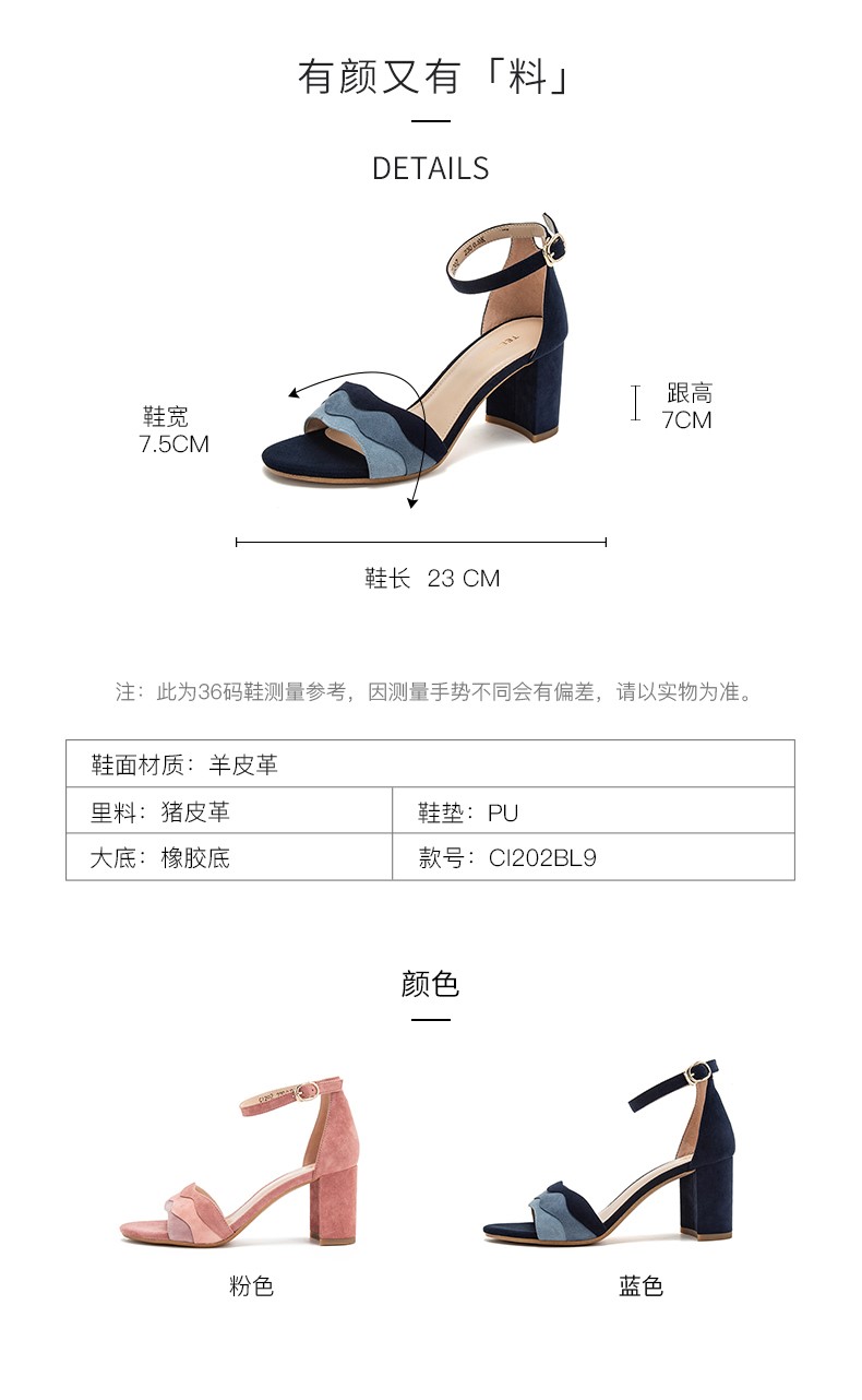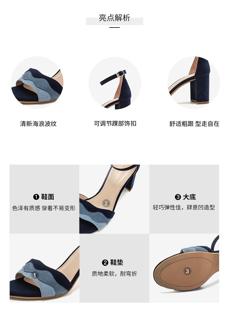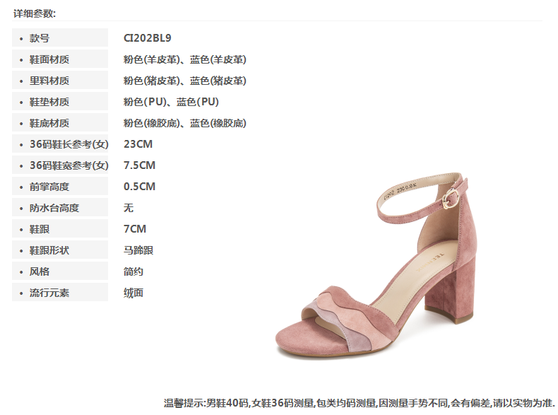 | 款式季节:夏季 | 鞋垫材质:PU | 渠道划分:专柜同款 | 前掌高度:0.5CM | 皮质特征:绒面皮 |