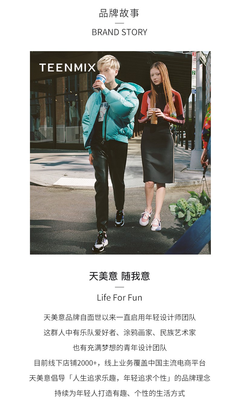 Teenmix(天美意),作为一个都市时尚休闲品牌,倡导“life for fun ,style for teens”即 “人生追求情趣,年轻追求个性”的生活品位,迎合都市年轻人不拘一格,追求mix&match自由组合,创出自我风格的潮流理念。Teenmix向人们展示了流行的转变,强调创意与个性,“teen”代表一群张扬个性、散发活力、追求都市炫彩生活的新新人群;“ mix”即mix&match,代表时尚混搭精神,品牌为年轻人提供恍如贴身订造的时尚潮品,并因应时尚的转变而响应。“随我意,天美意”传达了品牌的主张与个性。