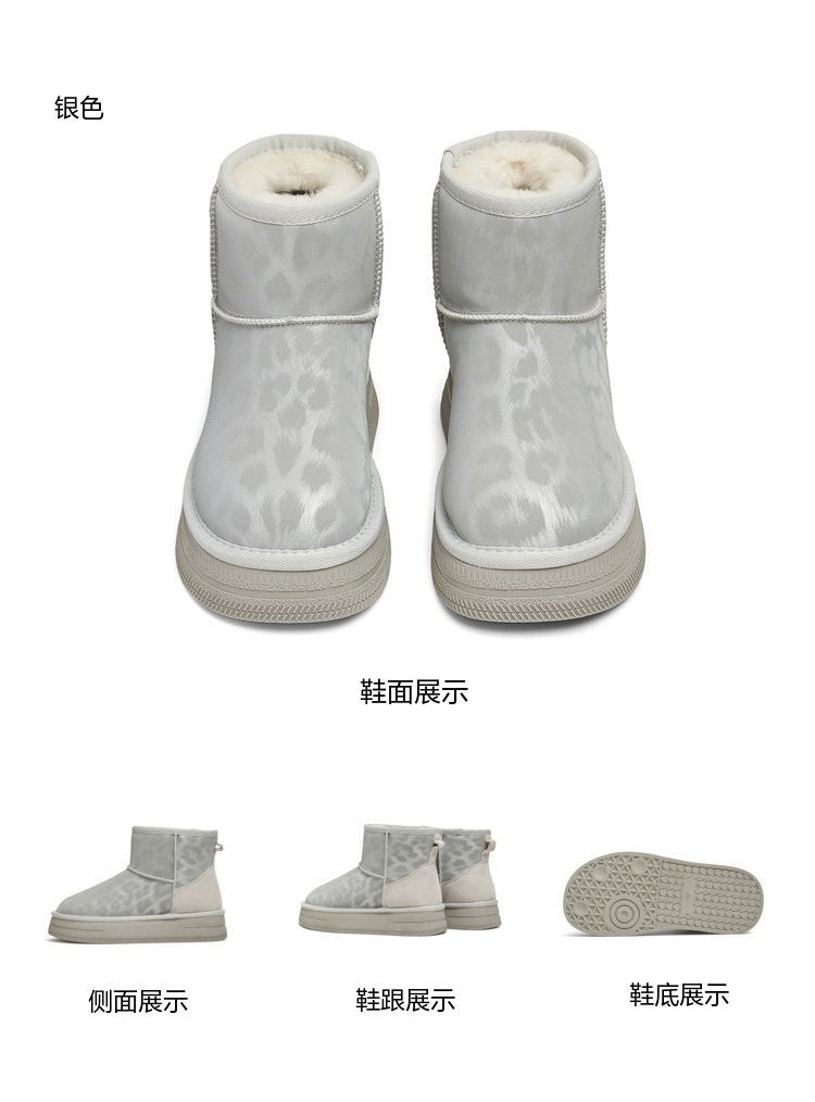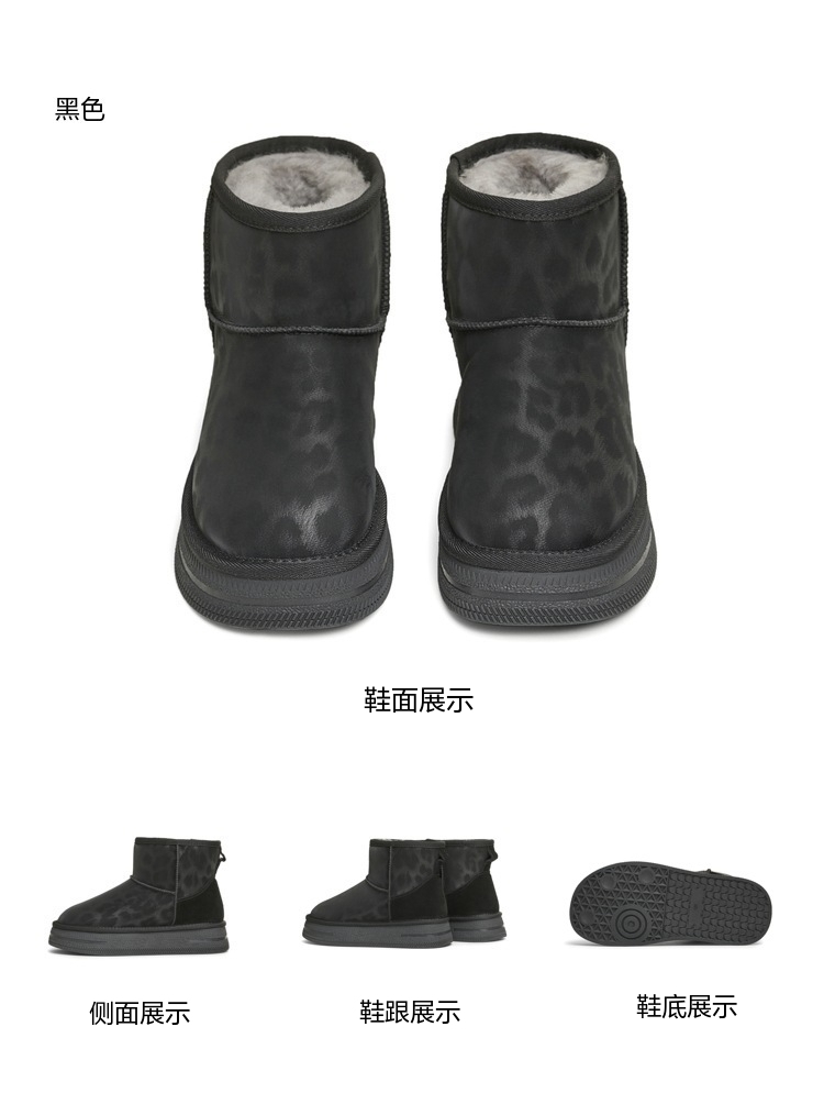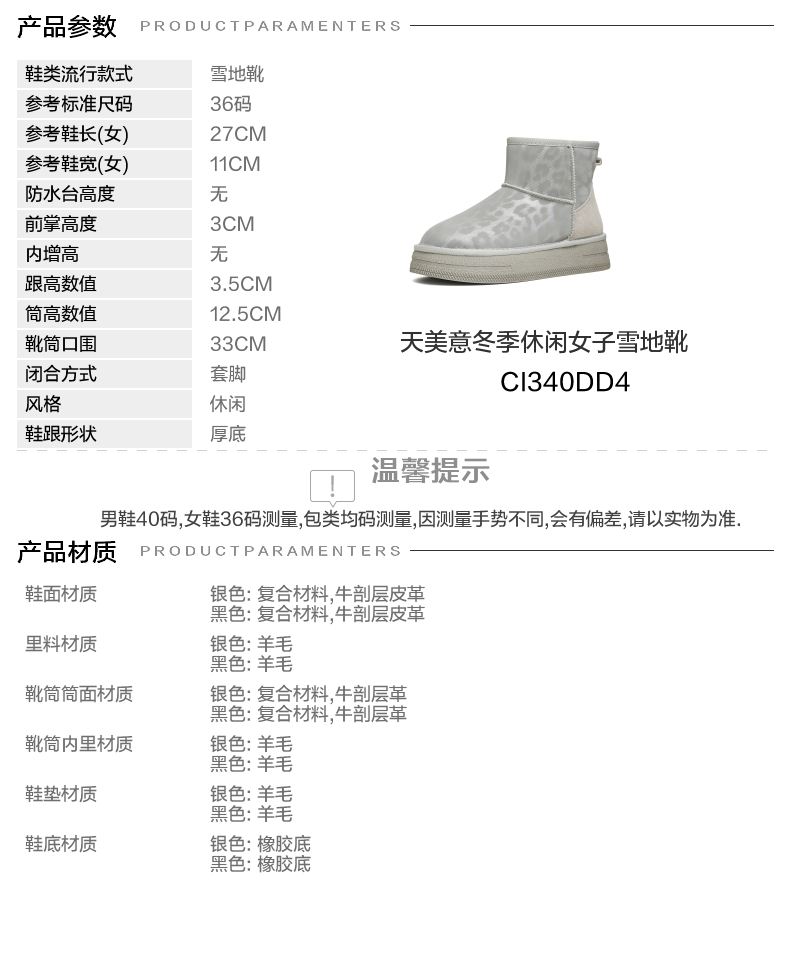 | 款式季节:冬季 | 前掌高度:3CM | 皮质特征:二层皮 | 防水台高度:无 |