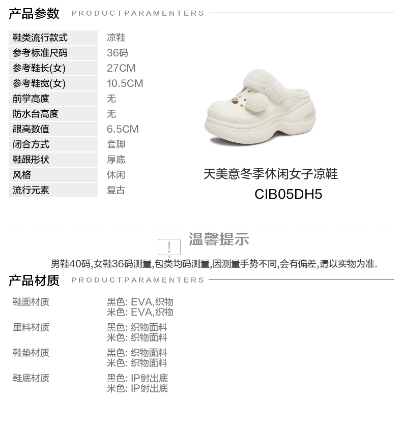 | 鞋头款式:圆头 | 鞋底材质:IP射出底 | 鞋面图案:纯色 | 鞋跟形状:厚底 | 鞋面材质:EVA织物 |