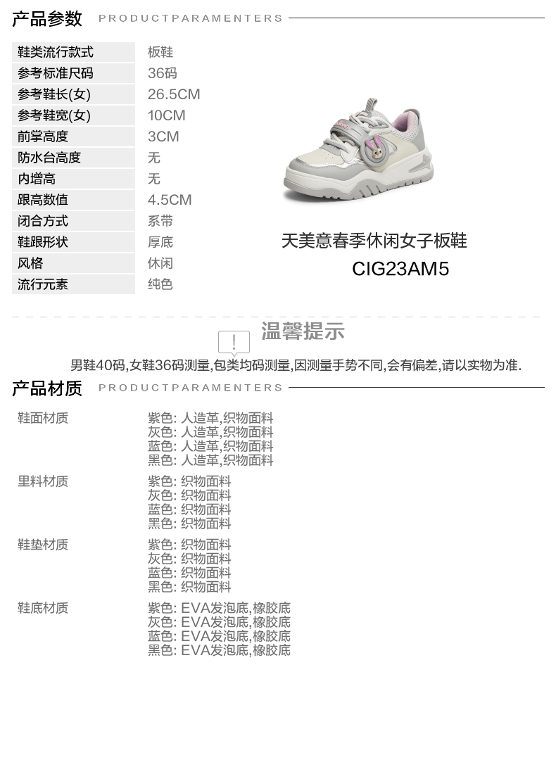 | 参考鞋宽(女):10CM | 风格:休闲 | 年份:2025年 | 色系:灰色 | 参考标准尺码:36码 |