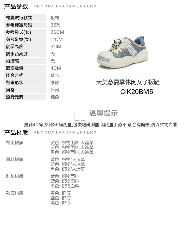 | 鞋垫材质:织物面料 | 前掌高度:3CM | 皮质特征:织物 | 鞋类流行款式:板鞋 |