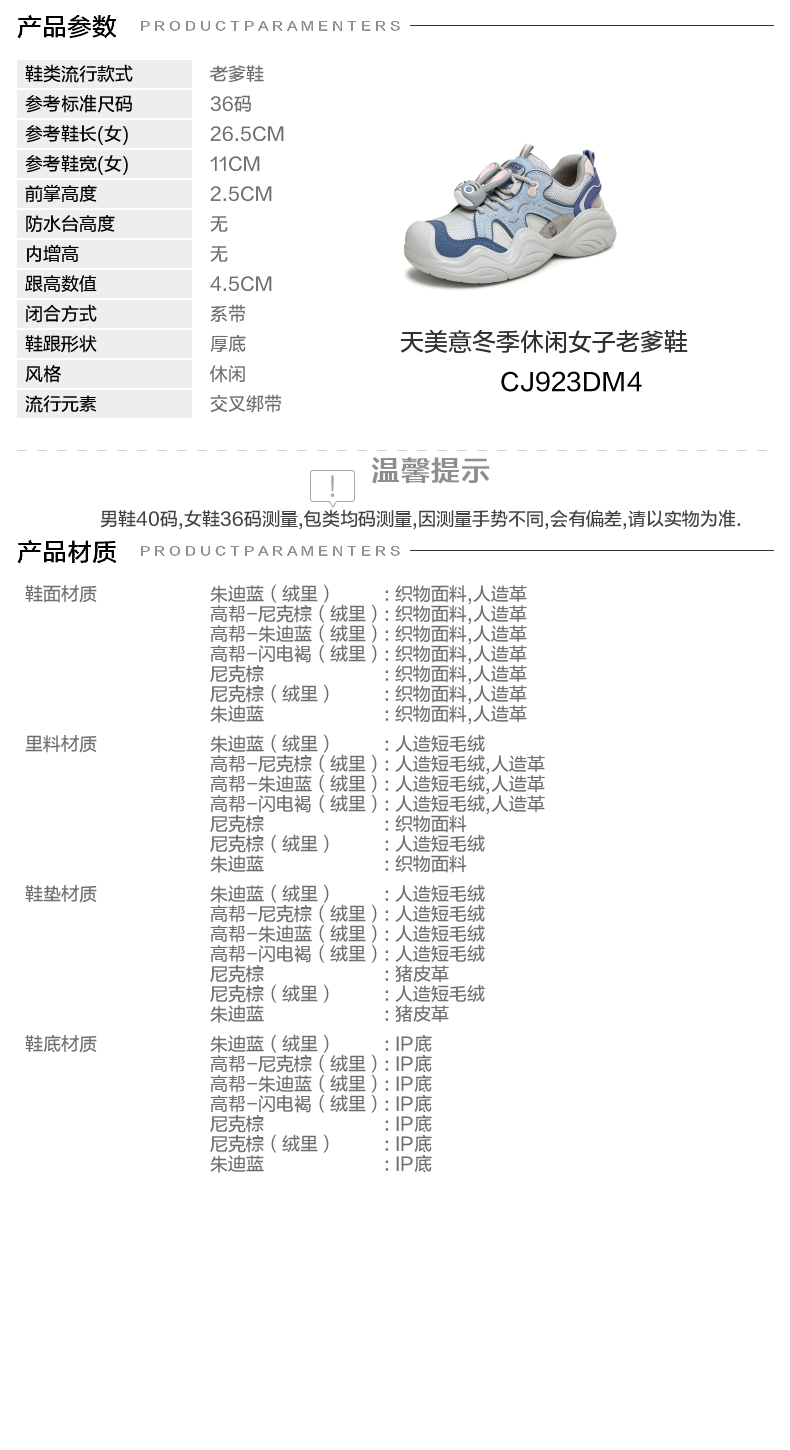 | 跟高数值:4.5CM | 性别:女子 | 里料材质:织物面料 | 制鞋工艺:胶贴皮鞋 | 款式季节:冬季 |