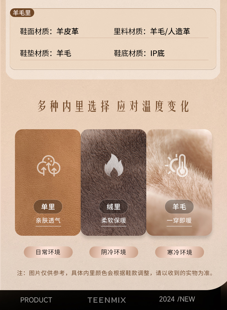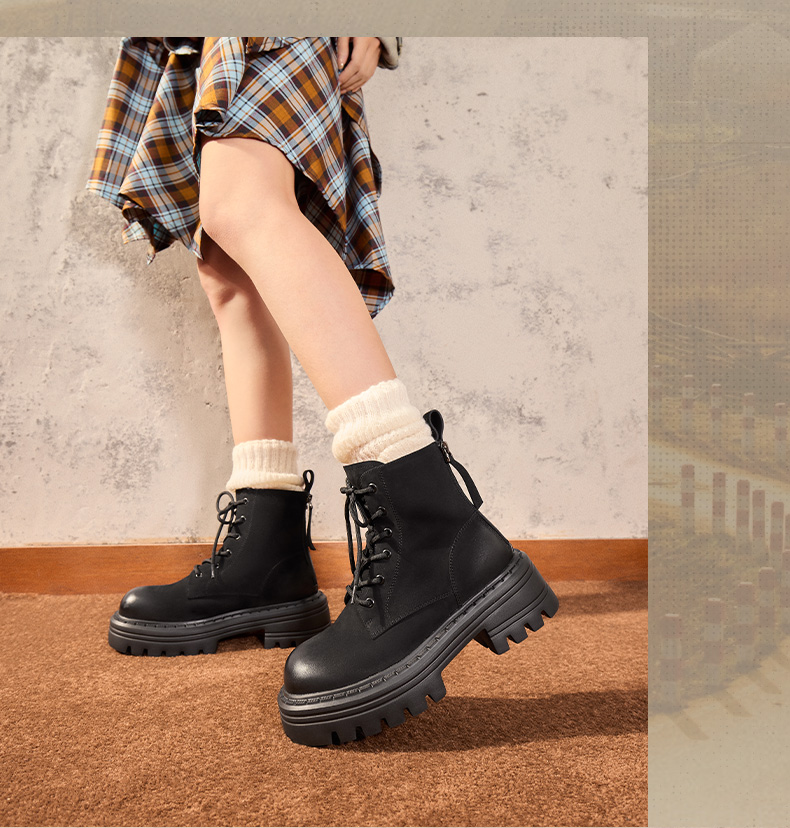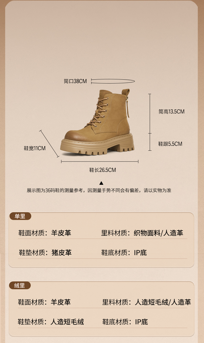 | 鞋底材质:IP底 | 靴筒内里材质:人造革羊毛 | 内增高:无 | 鞋面材质:羊皮革 | 闭合方式:后拉链系带 |