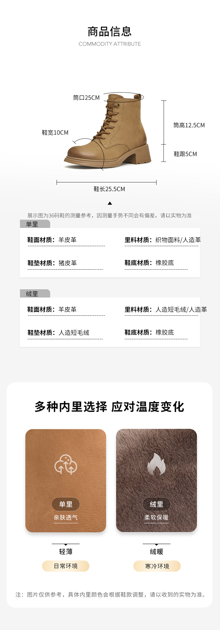 | 参考鞋宽(女):10CM | 风格:休闲 | 色系:棕色 | 跟高数值:5CM | 筒高数值:12.5CM |