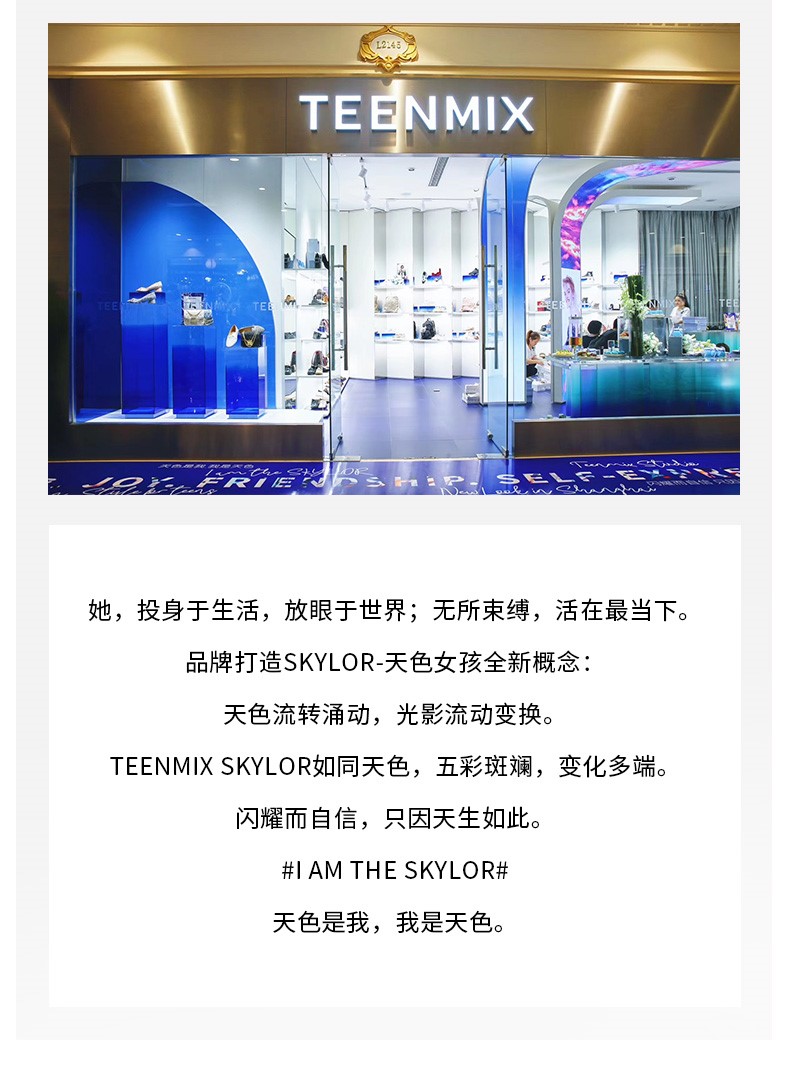 Teenmix(天美意),作为一个都市时尚休闲品牌,倡导“life for fun ,style for teens”即 “人生追求情趣,年轻追求个性”的生活品位,迎合都市年轻人不拘一格,追求mix&match自由组合,创出自我风格的潮流理念。Teenmix向人们展示了流行的转变,强调创意与个性,“teen”代表一群张扬个性、散发活力、追求都市炫彩生活的新新人群;“ mix”即mix&match,代表时尚混搭精神,品牌为年轻人提供恍如贴身订造的时尚潮品,并因应时尚的转变而响应。“随我意,天美意”传达了品牌的主张与个性。
