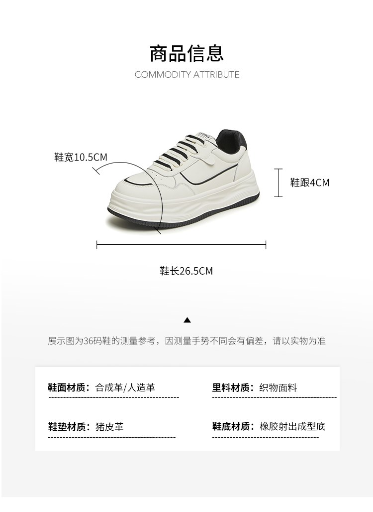 | 参考鞋长(女):26.5CM | 参考鞋宽(女):10.5CM | 风格:休闲 | 色系:浅白色 | 参考标准尺码:36码 |