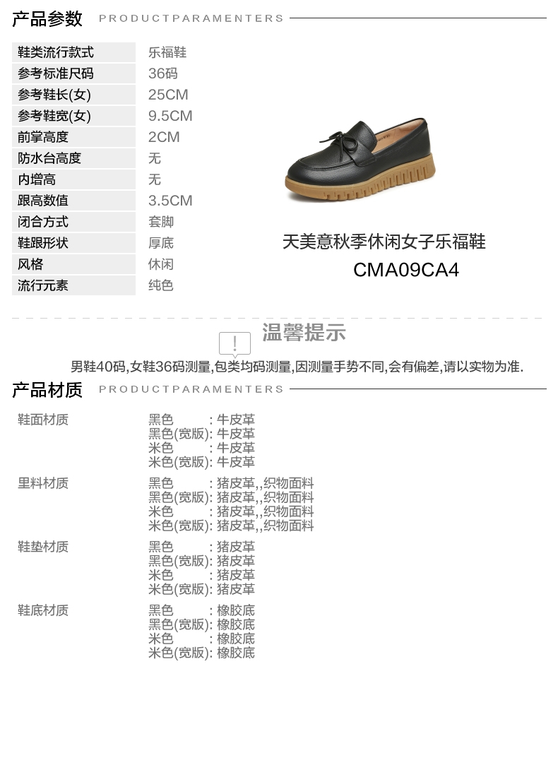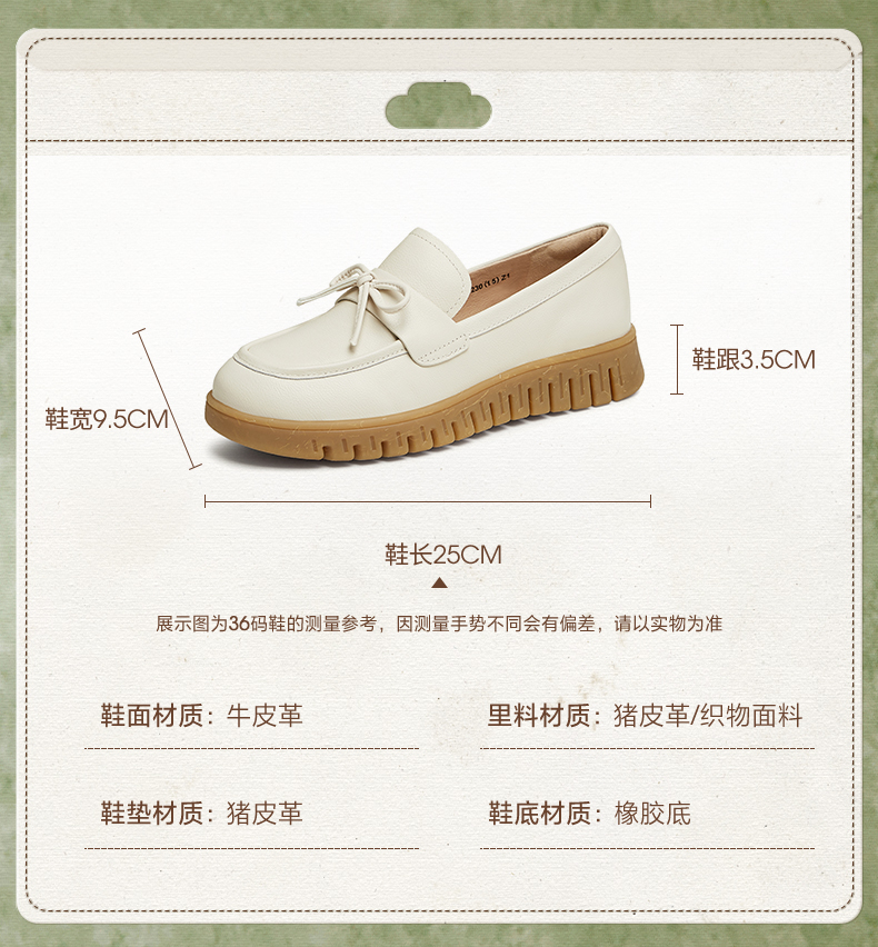 | 性别:女子 | 里料材质:超纤皮革猪皮革织物面料 | 制鞋工艺:胶贴皮鞋 | 款式季节:秋季 | 鞋垫材质:猪皮革 |
