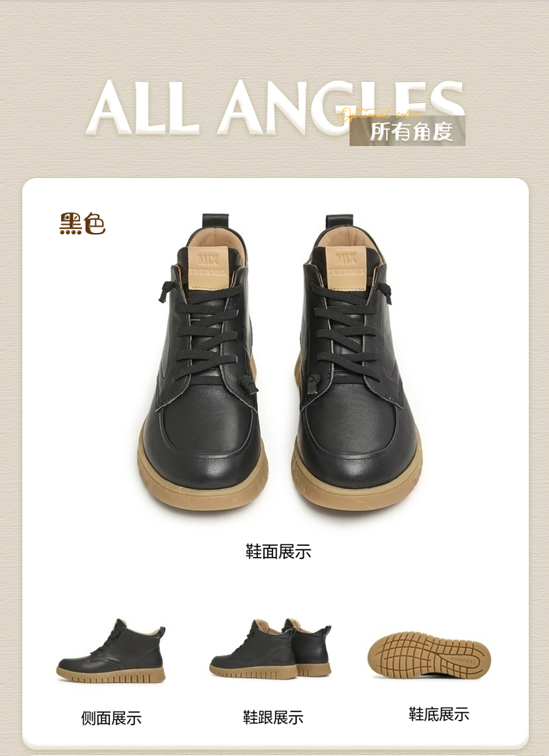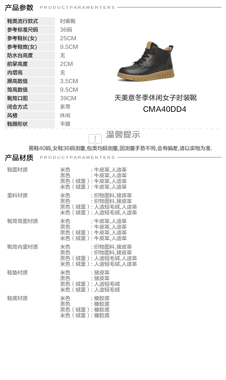 | 里料材质:猪皮革织物面料 | 制鞋工艺:胶贴皮鞋 | 款式季节:冬季 | 鞋垫材质:猪皮革 | 渠道划分:线下同步 |