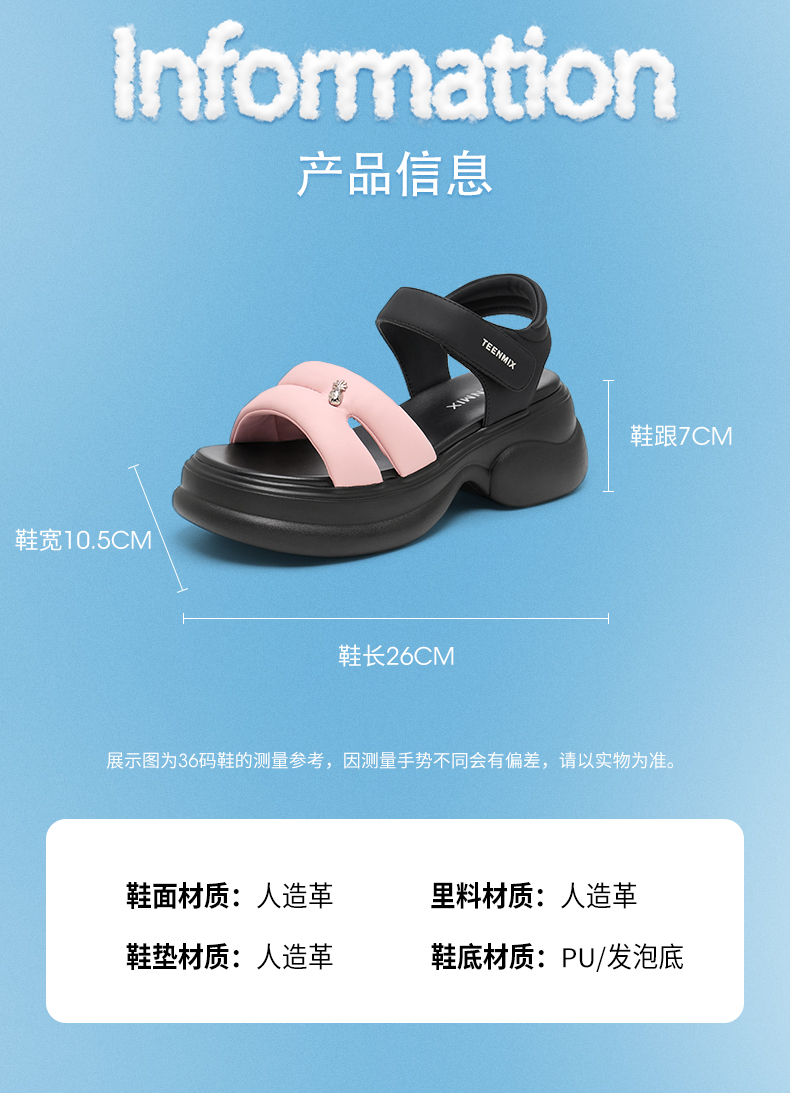 | 鞋头款式:露趾 | 鞋底材质:发泡底PU | 鞋面图案:纯色 | 鞋跟形状:松糕 | 鞋面材质:人造革 |
