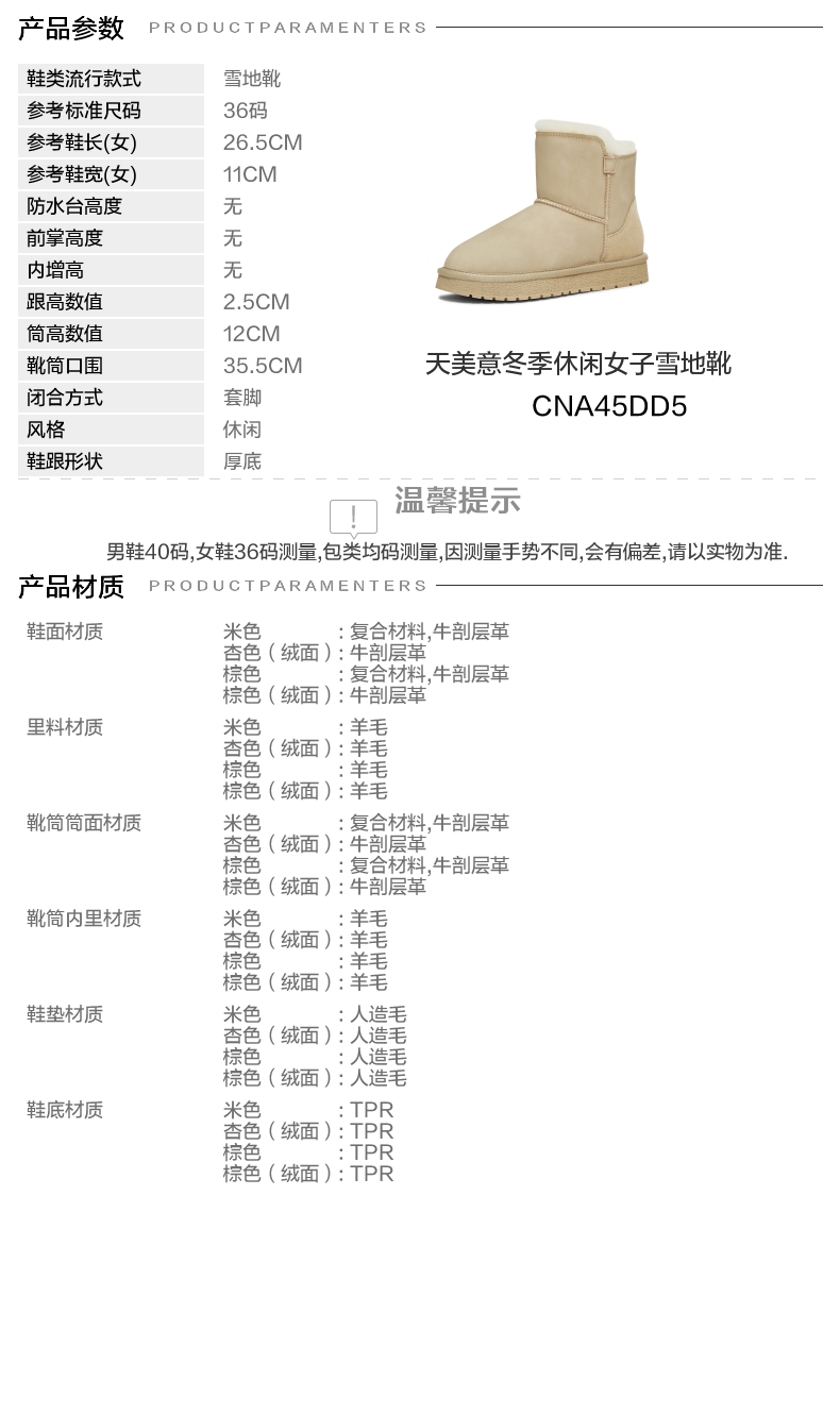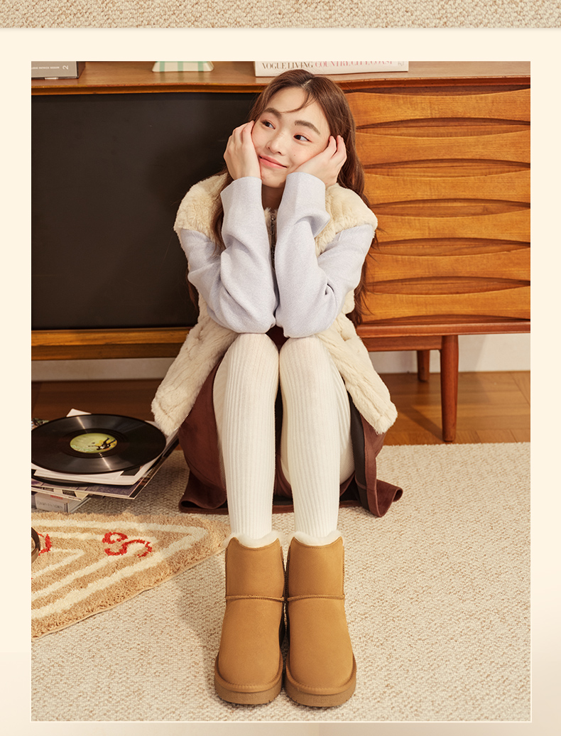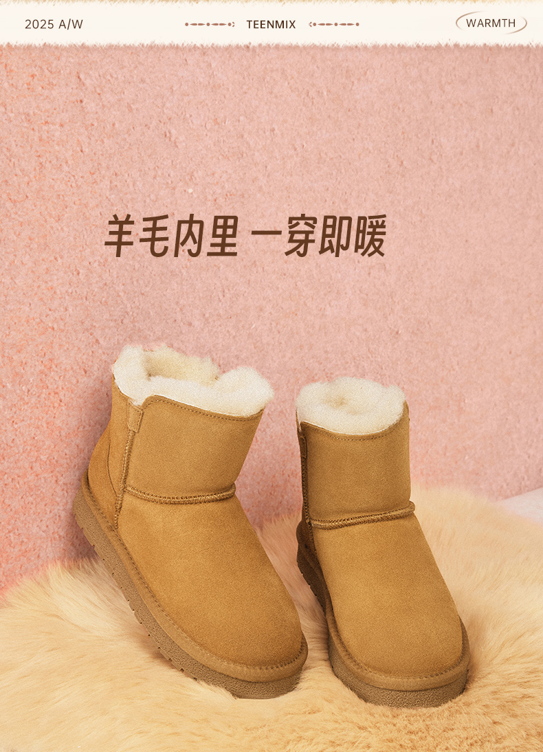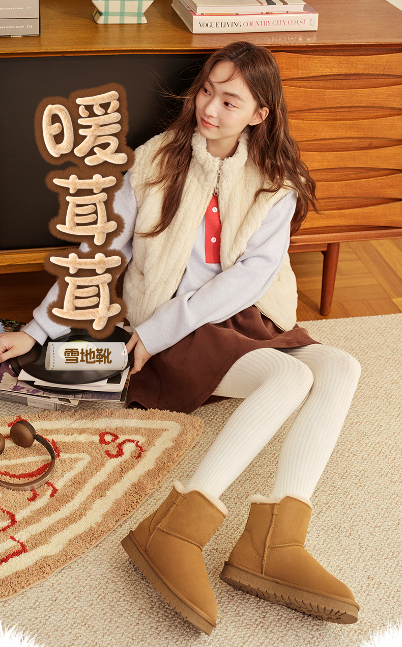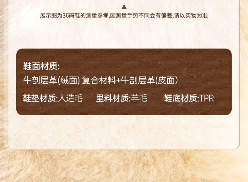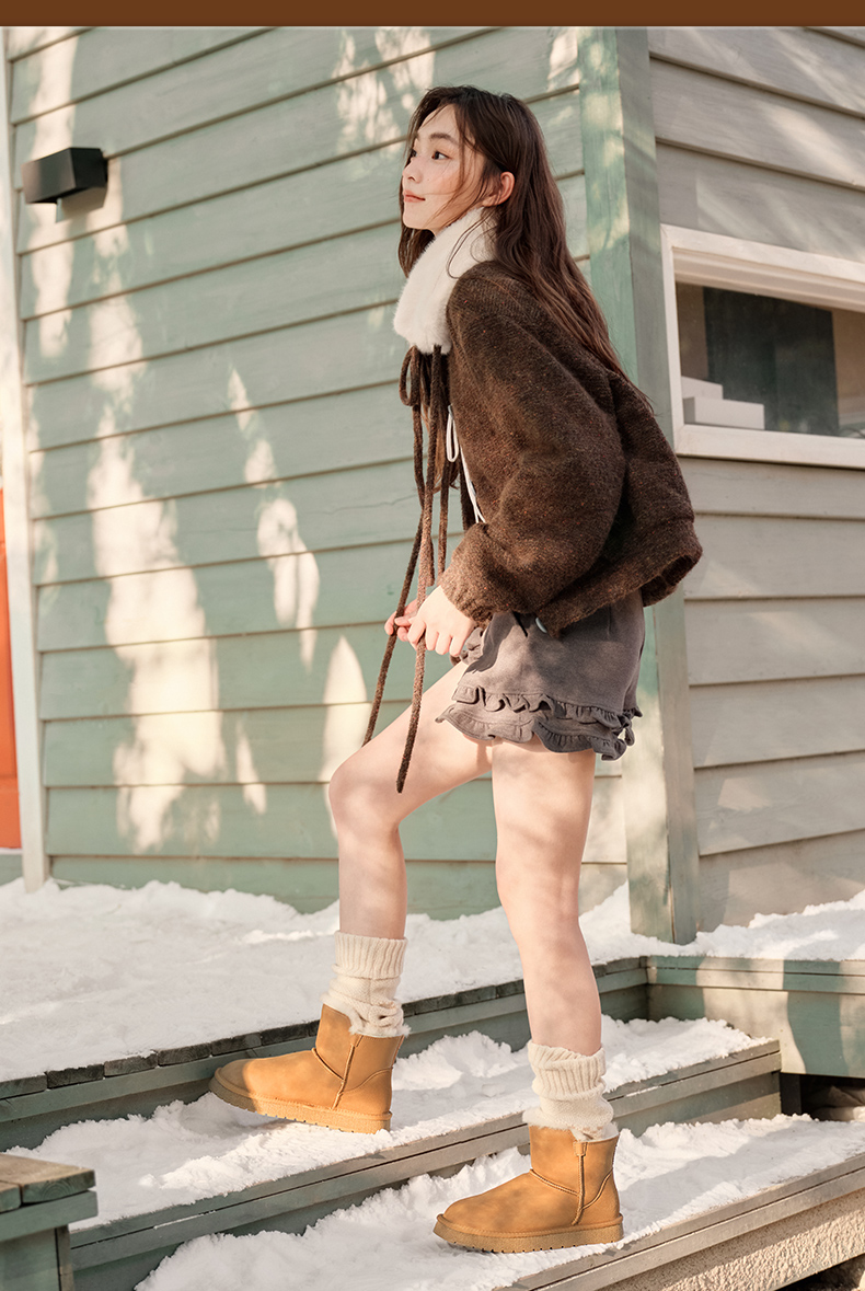 | 帮面材质:牛剖层革 | 配跟:无 | 靴筒口围:35.5CM | 上市时间:2025年冬季 | 鞋类流行款式:雪地靴 |