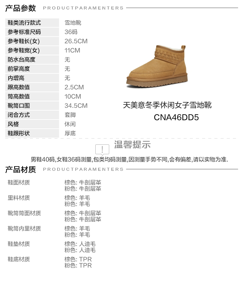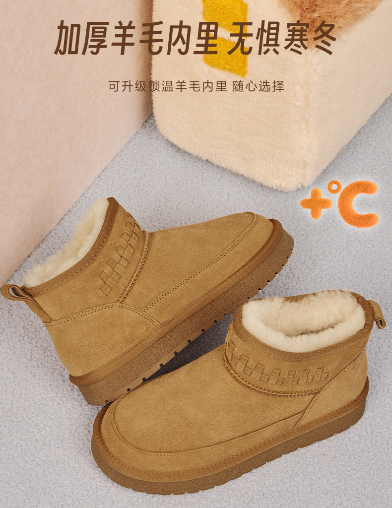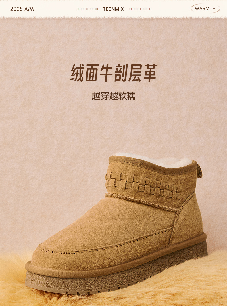 | 帮面材质:牛剖层革 | 配跟:无 | 靴筒口围:34.5CM | 上市时间:2025年冬季 | 鞋类流行款式:雪地靴 |