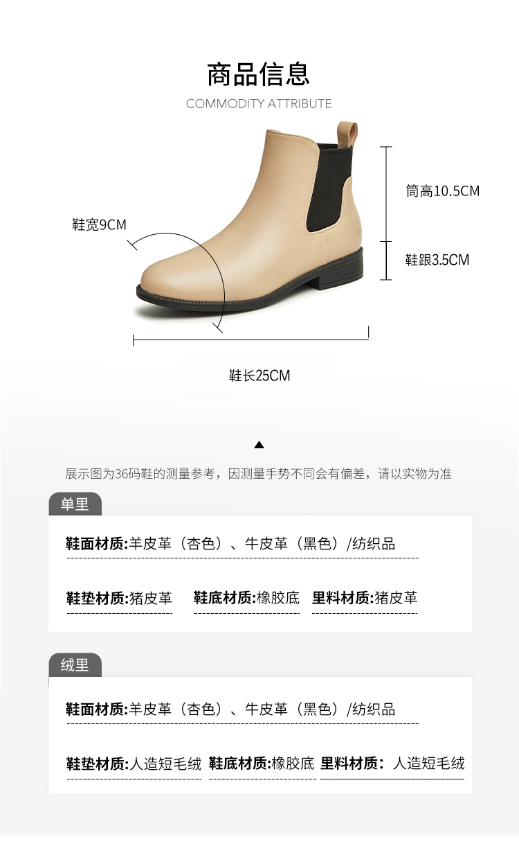 | 帮面材质:织物牛皮 | 配跟:无 | 靴筒口围:25.5CM | 上市时间:2023年冬季 | 鞋类流行款式:切尔西靴 |
